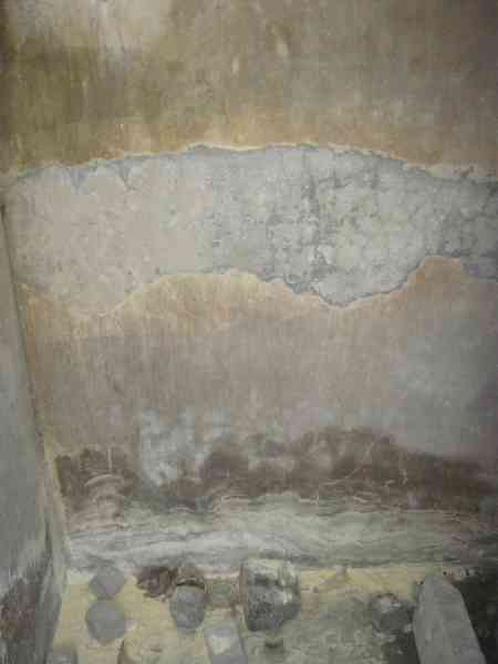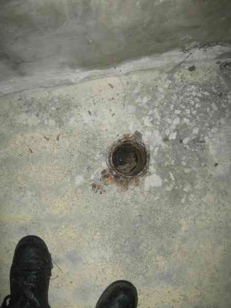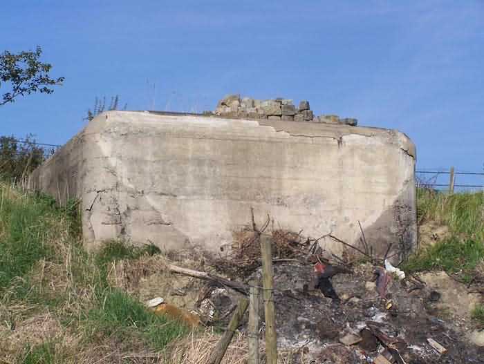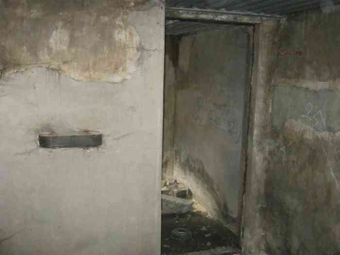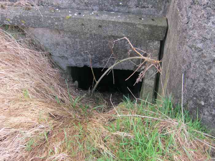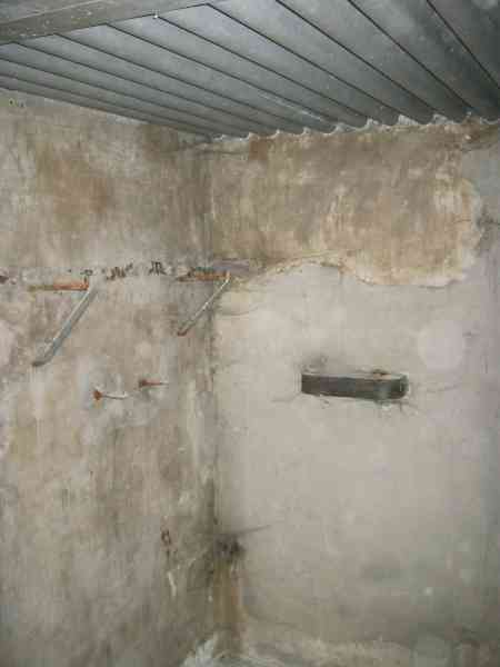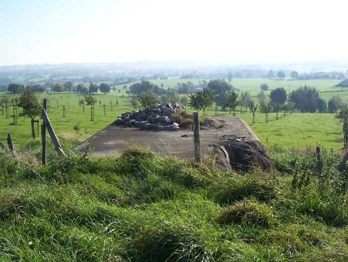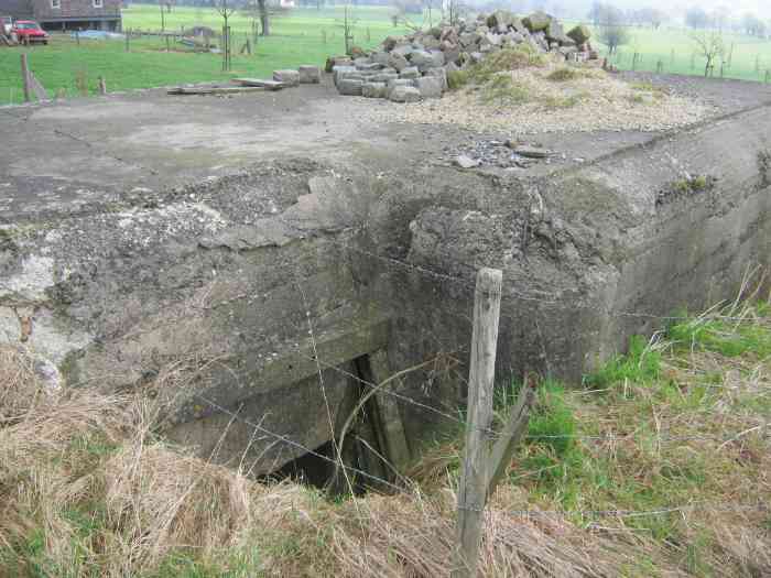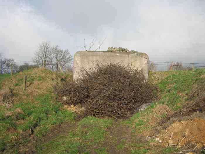 Belgian fortifications from the Second World War, fortified position of Liège, first line of resistance, interval Manaihant-Margarins, shelter MM 13. Externally it seems in good condition, a considerable number of concrete fence posts of the military compound remain, all openings are walled up or provided with a parapet and a pile of stones obstructs its roof (2009). An opening has been created and the interior is revealed without a P1 entrance gate or a louvered door P2, but the metal brackets for the wooden shelves, the fitting for the L1 hook intended for the Coleman lamp, without the hook, the L2 hooks for the personal equipment of the personnel, the L3 hooks for personal weapons, the shelf for the cartridge hopper and its fixing brackets are in place. The FRC mount has been removed. The interior is clean and cleared.