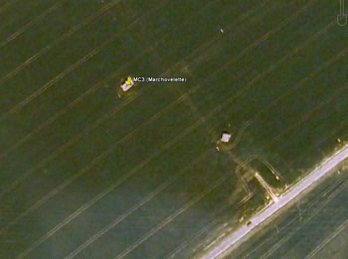 Fortifications belges de la deuxième guerre mondiale, position fortifiée de Namur, intervalle Marchovelette - Cognelée, deuxième ligne de résistance, abri MC 3 de Marchovelette, 188 m/alt. Situé en plein champ, Rue de la Chasse à Fernelmont, à 80 m au nord-ouest de l’abri MC 3 Fernelmont, il s’agit d’un abri d’intervalle simple flanquant avec une embrasure pour une mitrailleuse. Dans la façade opposée au bouclier se trouve l’entrée munie d’un sas défendu par un créneau pour un fusil-mitrailleur sans affût et une goulotte lance-grenades ainsi que l’issue de secours communiquant directement avec la chambre de tir. Il semble être dans un état de conservation correct.