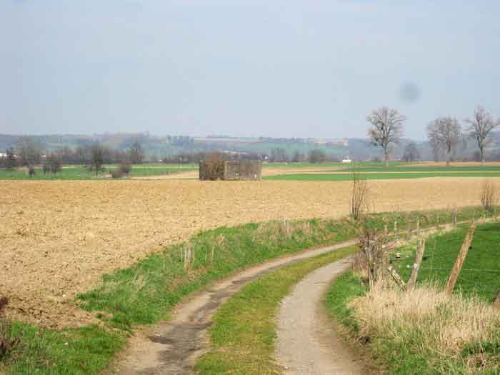 Belgische Festungen des Zweiten Weltkriegs, Festungsstellung Lüttich, erste Widerstandslinie, Intervall Neufchâteau-Visé, Unterstand NV7. NV7 befindet sich in einem Feld, 200 m von der Straße von Battice nordwestlich von Bombaye entfernt. Er deckte die Nordflanke des Dorfes Bombaye und konnte sein Feuer mit dem Unterstand MN6 kreuzen. Die Schiesscharte ist vermauert. NV 7 hatte eine Verblendmauer als Tarnung; Stahlstangen sind noch vorhanden. Das Äußere ist in gutem Zustand. Der Zugang ist schwierig. Das Innere ist in gutem Zustand und fast vollständig; das Tablett fehlt. Chardôme-Lafette. Eine Granatwurfrinne, deren Verschlussklappe verschwunden ist, verteidigte den Eingang. Erhebliche Schäden sind am unteren Teil der Wand der Lamellentür P2 auf der Öffnungsseite sowie an der Bodenplatte sichtbar.