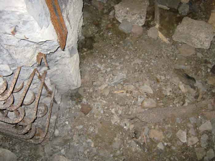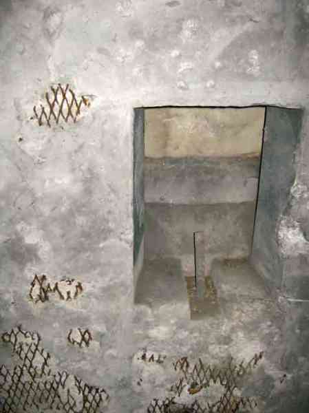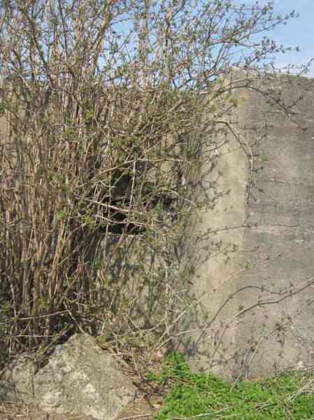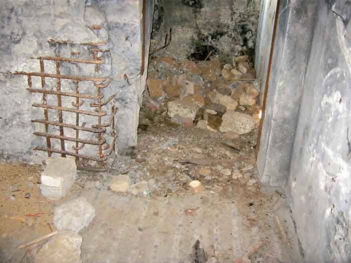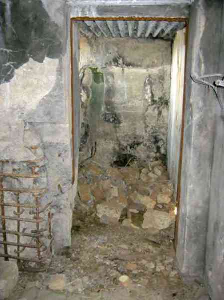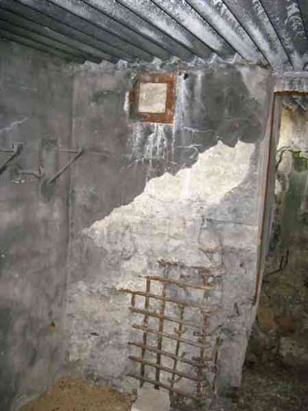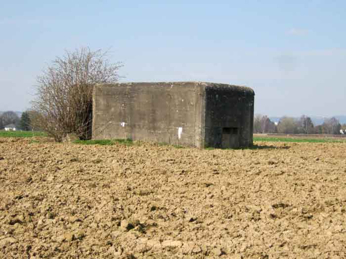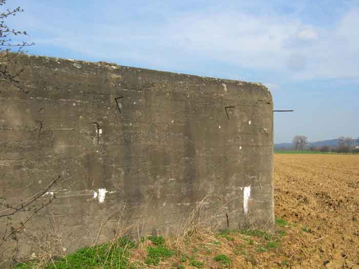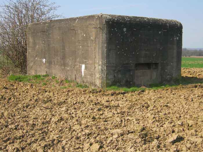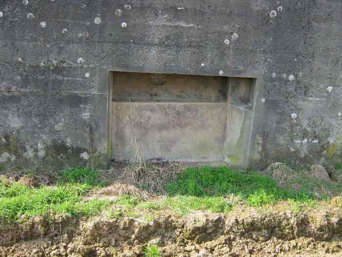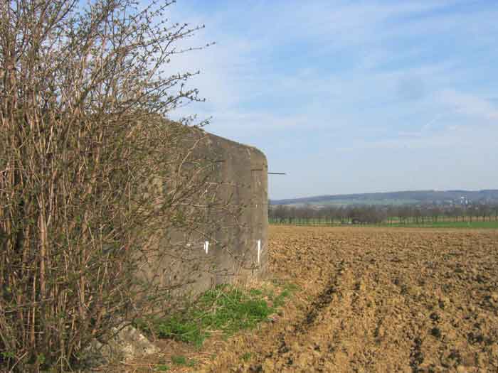 Belgian fortifications of the Second World War, fortified position of Liège, first resistance line, Neufchâteau-Visé interval, shelter NV7. NV7 is located in a field, 200 m from the road from Battice northwest of Bombaye. It covered the northern flank of the village of Bombaye and could cross its fire with shelter MN6. The embrasure is walled up. NV 7 had a facing wall as camouflage; steel rods are still present. The exterior is in good condition. Access is difficult. The interior is in good condition and almost complete; the shelf has disappeared. Chardôme mount. A grenade launching chute, the closing flap of which has disappeared, defended the entrance. Significant damage is visible at the bottom of the wall of the louvered door P2 on the opening side as well as the foundation slab.