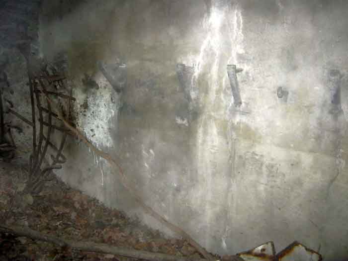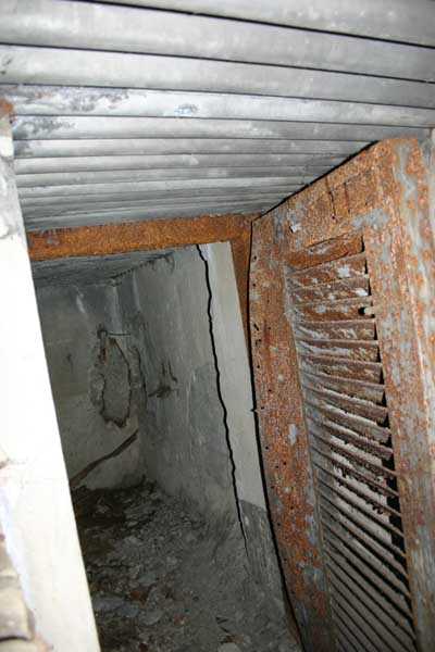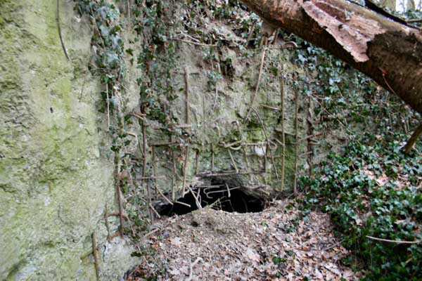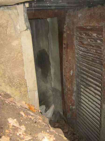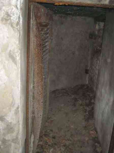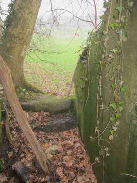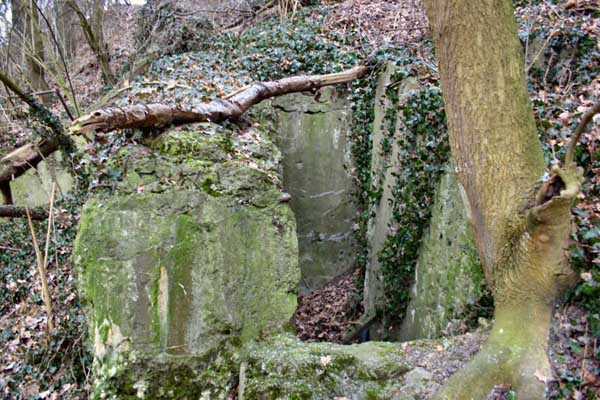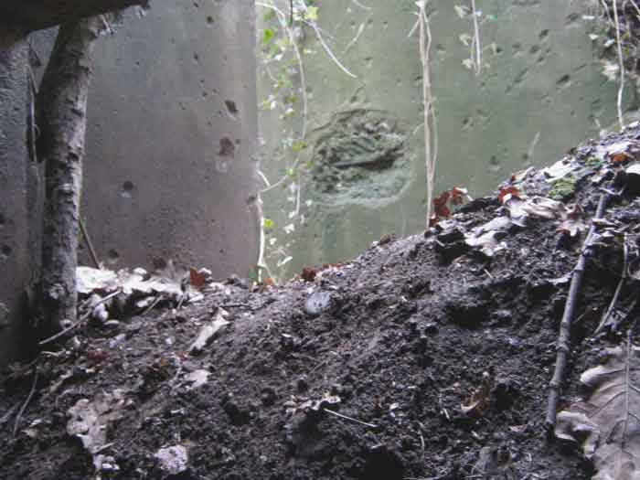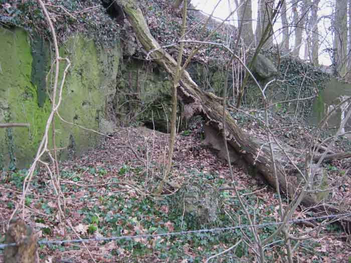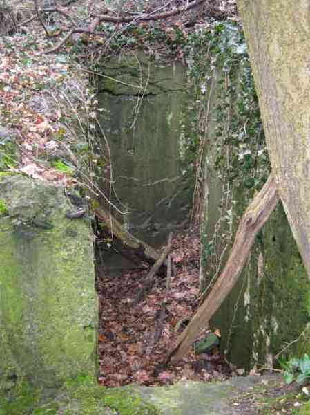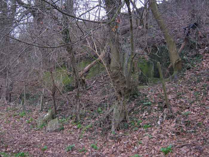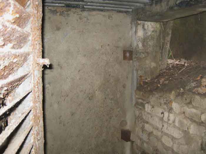 Belgian fortifications of the Second World War, fortified position of Liège, first resistance line, Neufchâteau-Visé interval, shelter NV10. NV 10 is located below the slope at the level of the Berwinne at the bottom of a meadow, 30 meters from a path. It covered the valley in the direction of the railway bridge. It crossed its fire with NV11 and NV12. It is partly buried with a cellar entrance. A retaining wall prevents the earth from collapsing in front of the embrasure. On the opposite side, an orillon has been built. The embrasure is totally destroyed and partly backfilled with earth. The entrance is accessible but one must lie down. The stairs are partly filled in. The interior is complete, the plate of the cartridge hopper is missing. The louvered door P2 is present. It is very difficult to determine which mount was installed due to the damage caused to the embrasure. No grenade launching chute. Some of the posts are still present.