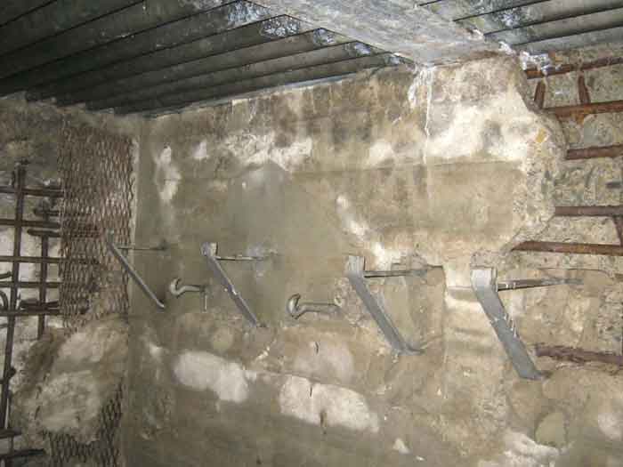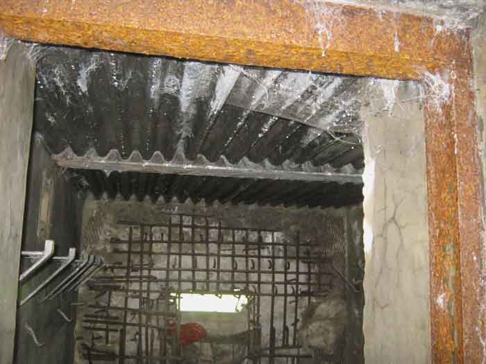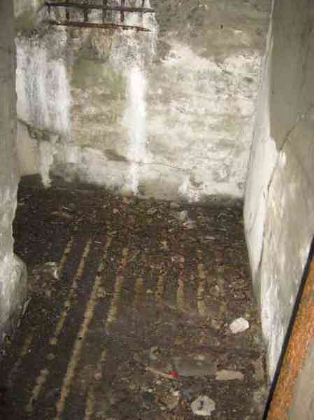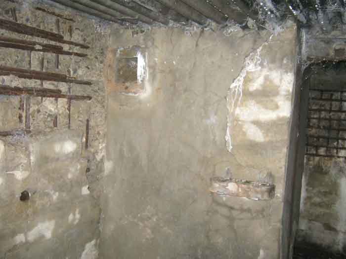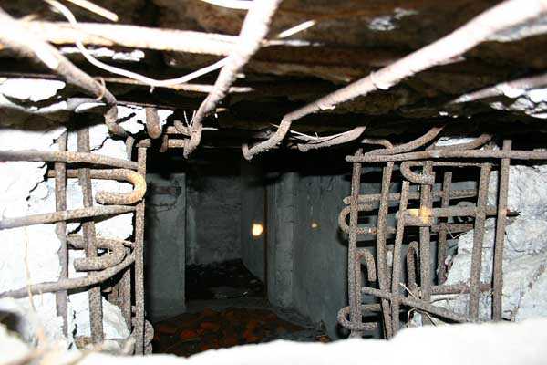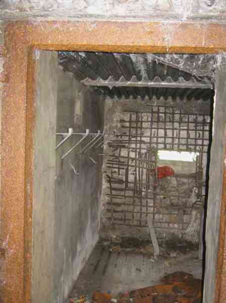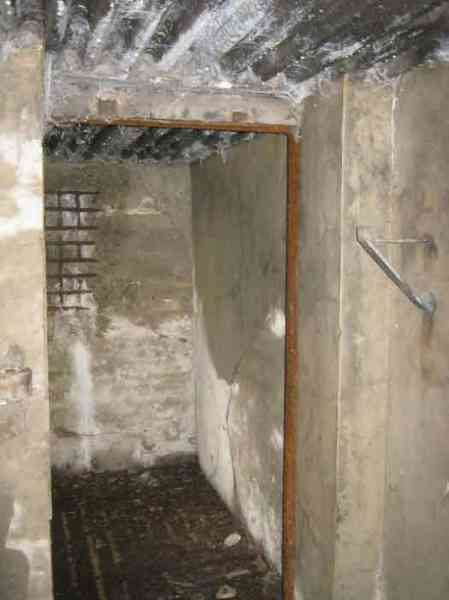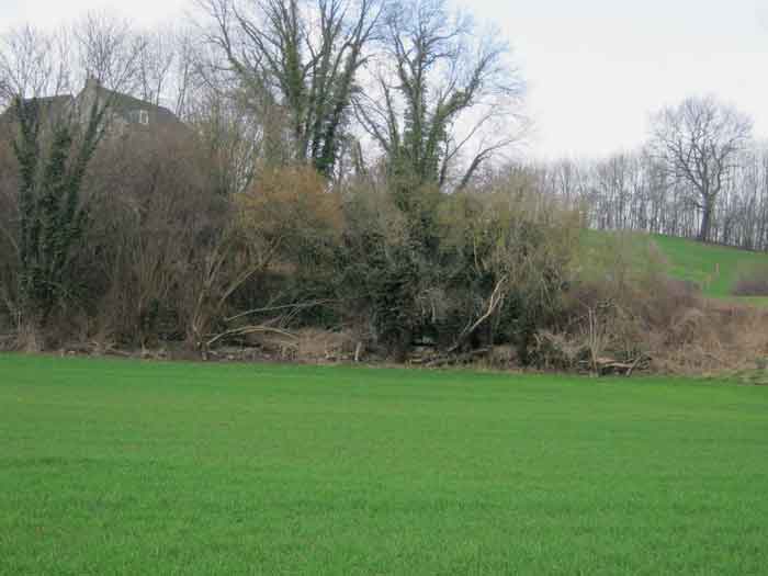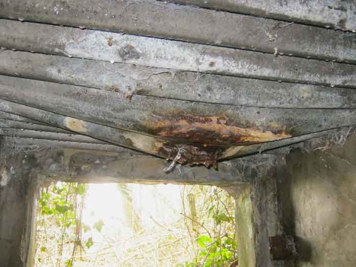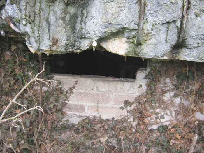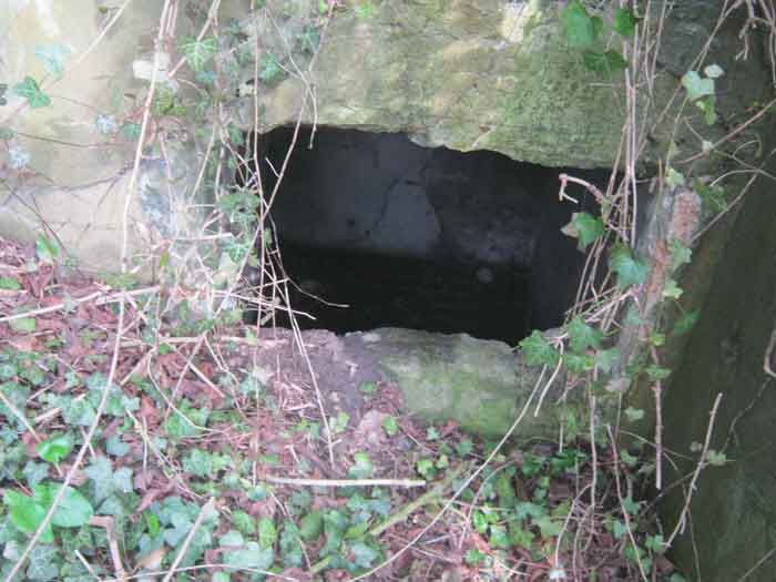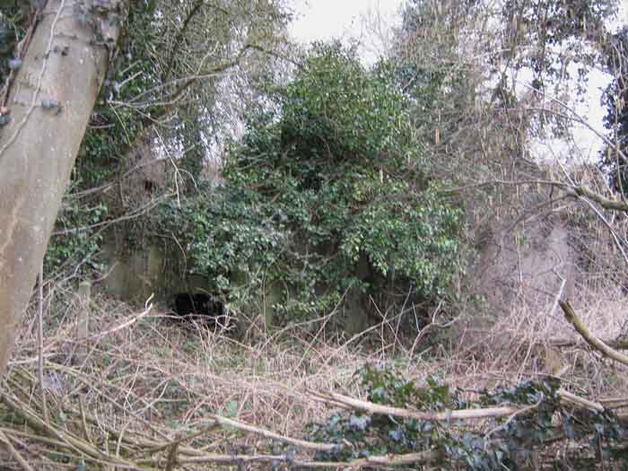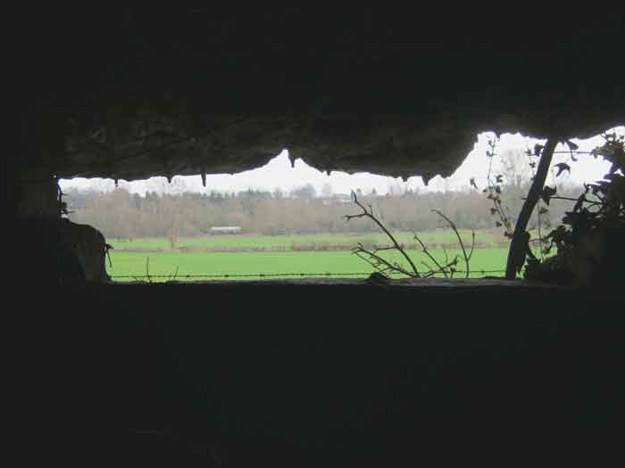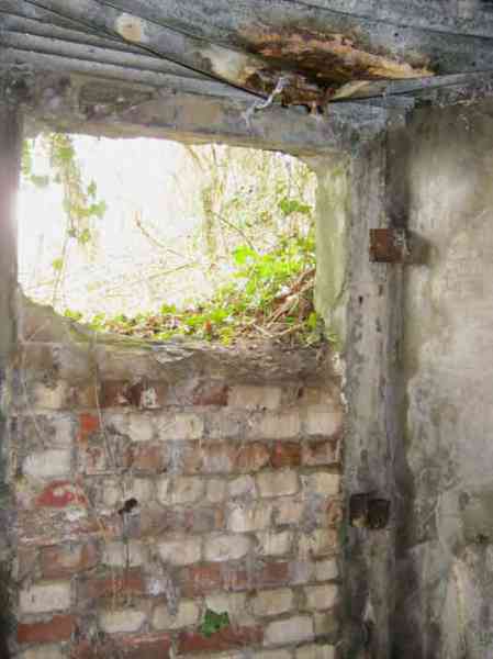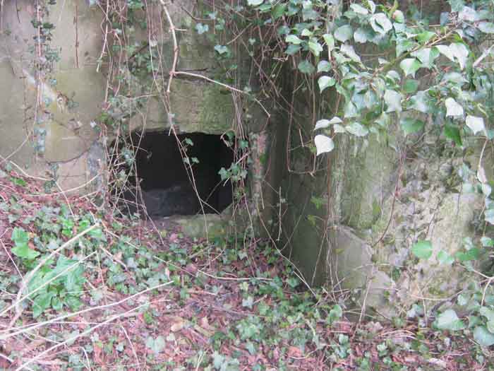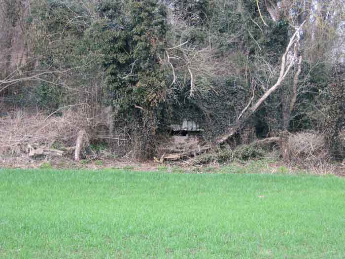 Belgian fortifications of the Second World War, fortified position of Liège, first resistance line, Neufchâteau-Visé interval, shelter NV12. NV12 is located in the embankment of the N608 from Berneau to Visé. It covered the Berwinne valley in the direction opposite the railway bridge. It crossed its fire with NV10 and NV11. Hard to spot, the work is covered with vegetation. The embrasure is partly walled up. The exterior appears in good condition. Significant damage is visible around the embrasure. The entrance is accessible but not easy. The interior is heavily degraded but complete. Chardôme mount. Only the two uprights remain. Two grenade launching chutes, one defending the entrance, the other the opposite side. The closing flaps of the chutes have disappeared. Significant damage is visible inside, the wall on the embrasure side has its bars exposed. In the corner, also a grenade launcher and in the airlock, the wall, the foundation slab and the ceiling. Part of the fence is still present and the live hedge as well. It is hard to see from the main road.
