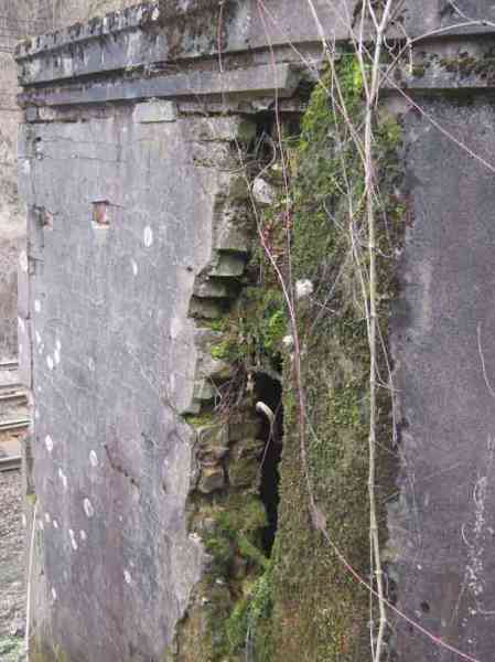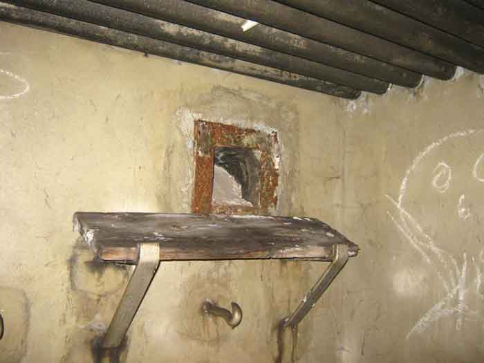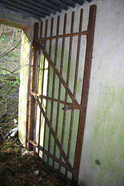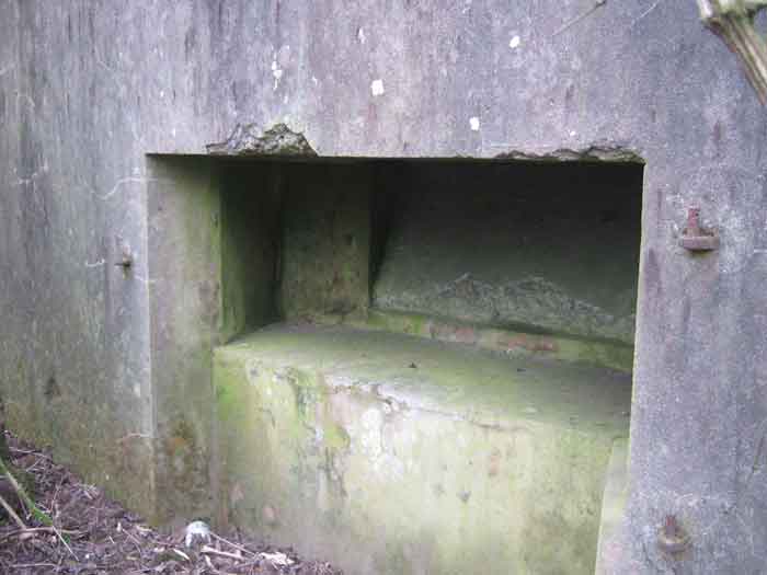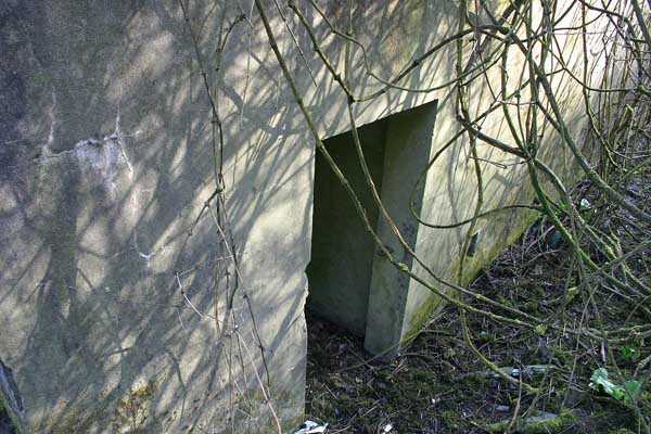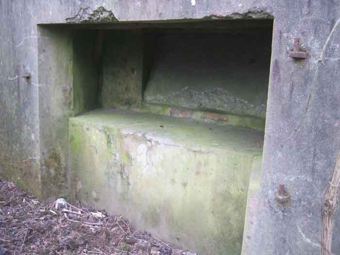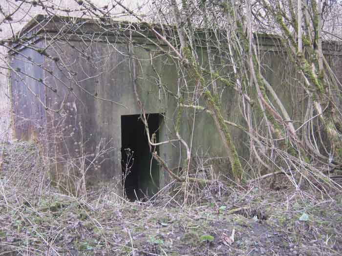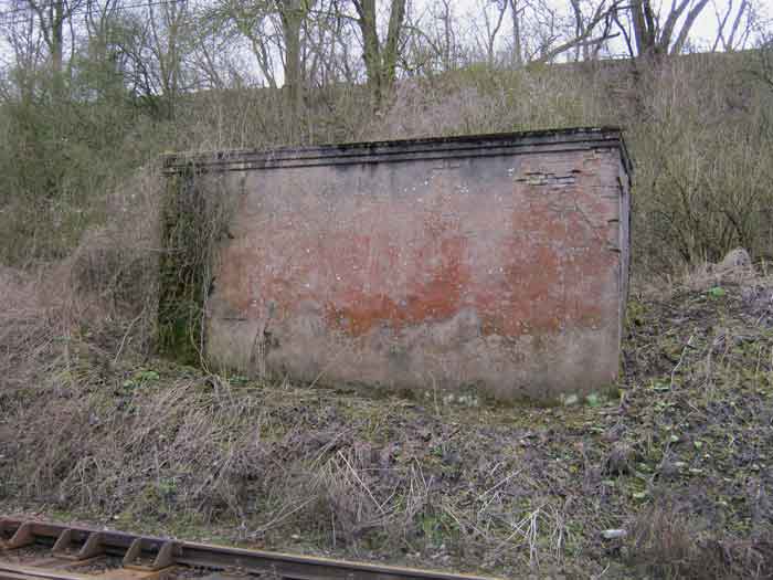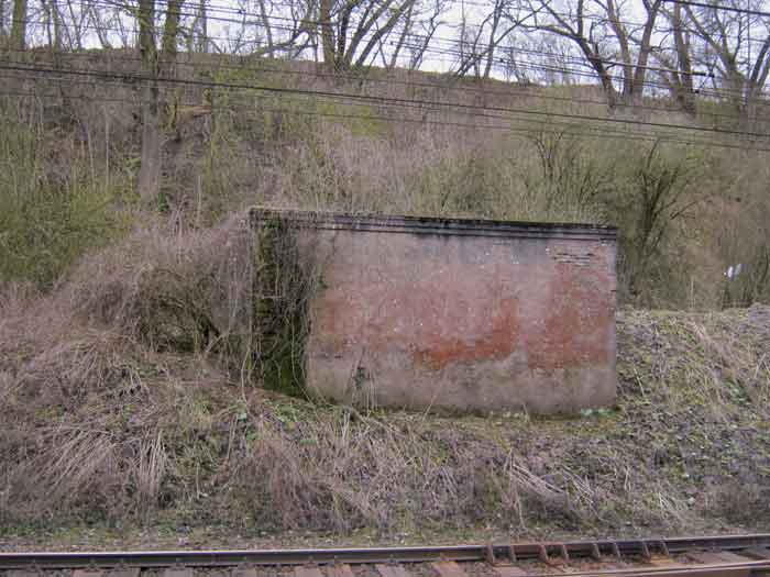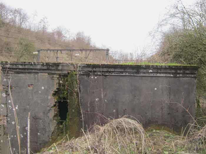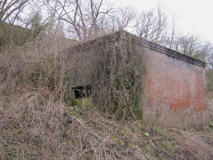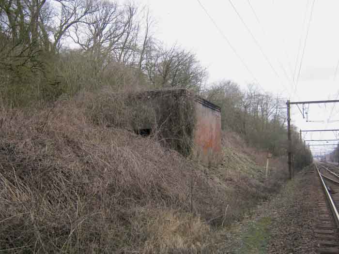Belgian fortifications of the Second World War, fortified position of Liège, first resistance line, Neufchâteau-Visé interval, shelter NV14. NV14 is located on the south side of the railway cutting going towards Visé, 420 m from the bridge. Its mission was to prevent any incursion through this passage. The work is not parallel to the track. The entrance is not placed in the recess of the airlock but opposite it, which gives the work a recess. A brick wall covered with red-painted cement gives the work a cubic shape. A cement cornice and this gives the effect of a railway building. The exterior is in good condition. The embrasure is walled up and the axles for the pivot shutter are present. The entrance is open. The interior is in good condition and complete. The support of the Chardôme mount no longer has its circular part. Two grenade launching chutes, the first near the embrasure on the side opposite the entrance, the second to defend the entrance (the closing flaps have disappeared). The P1 entrance gate is still present but the P2 louvered door has disappeared.