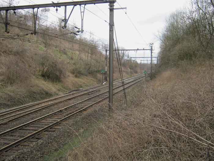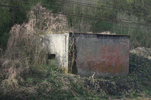 Belgische Festungen des Zweiten Weltkriegs, Festungsstellung Lüttich, erste Widerstandslinie, Intervall Neufchâteau-Visé, Unterstand NV14. NV14 befindet sich auf der Südseite des Bahngrabens in Richtung Visé, 420 m von der Brücke entfernt. Seine Aufgabe war es, jeden Eindringling über diesen Durchgang zu verhindern. Das Werk verläuft nicht parallel zum Gleis. Der Eingang befindet sich nicht in der Nische der Schleuse, sondern gegenüber, was dem Werk eine Vertiefung verleiht. Eine Ziegelmauer, die mit rot gestrichenem Zement bedeckt ist, verleiht dem Werk eine kubische Form. Ein Zementgesims gibt den Eindruck eines Bahngebäudes. Das Äußere ist in gutem Zustand. Die Schiesscharte ist vermauert und die Achsen für den Drehverschluss sind vorhanden. Der Eingang ist offen. Das Innere ist in gutem Zustand und vollständig. Der Halter der Chardôme-Lafette hat seinen kreisförmigen Teil nicht mehr. Zwei Granatwerferschächte, der erste nahe der Schiesscharte auf der Seite gegenüber dem Eingang, der zweite zur Verteidigung des Eingangs (die Verschlussklappen sind verschwunden). Das Eingangsgitter P1 ist noch vorhanden, aber die Lamellentür P2 ist verschwunden.