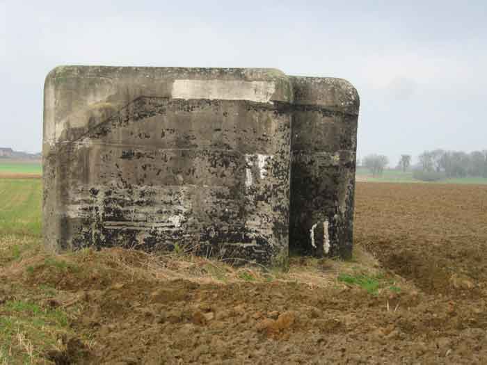Belgian fortifications of the Second World War, Fortified Position of Liège, first resistance line, Neufchâteau-Visé sector, shelter NV18. NV18 is located in a field 70 m from the Warsage–Mortroux road and 75 m from NV 17 which fired in the opposite direction. It covered the south of Bombaye and crossed its fire with NV19. The embrasure is open, the hinges and attachments for the pivoting sealing flap are present. The exterior is in good condition except for the front which has received impacts. The protective earth covering has been removed. The entrance is not placed in the recess of the airlock but opposite it and is walled up. The interior is in good condition and complete. Support for Chardôme mount. A grenade launcher duct defended the entrance. The embrasure is heavily damaged on the inside and outside. To enter the structure one must enter through the embrasure…