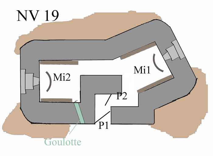 Belgische fortificaties van de Tweede Wereldoorlog, Versterkte Stelling Luik, eerste weerstandslijn, sector Neufchâteau-Visé, schuilkelder NV19. NV19 is een schuilkelder met twee schietkamers. Hij ligt in een weide op 125 meter van de nationale weg 627. Een schichtas Mi 2 dekte de weg naar Battice en het zuiden van het dorp in westelijke richting. Het schietgat is dichtgemetseld maar de scharnieren en bevestigingen voor de draaiende afsluitklep zijn aanwezig; de andere, Mi 1, dekte samen met NV18 de richting Warsage. Het schietgat is open. De dekkende aanaarding is verwijderd. De buitenkant en de binnenkant hebben aanzienlijke schade opgelopen. De ingang is open. Het interieur is gedeeltelijk compleet. Twee affuitonderstellen voor Chardôme. Een granaatwerperschacht dekt de ingang. Beide schietgaten zijn beschadigd. Geen enkel meerpaal ter afbakening van het militaire domein is nog aanwezig.