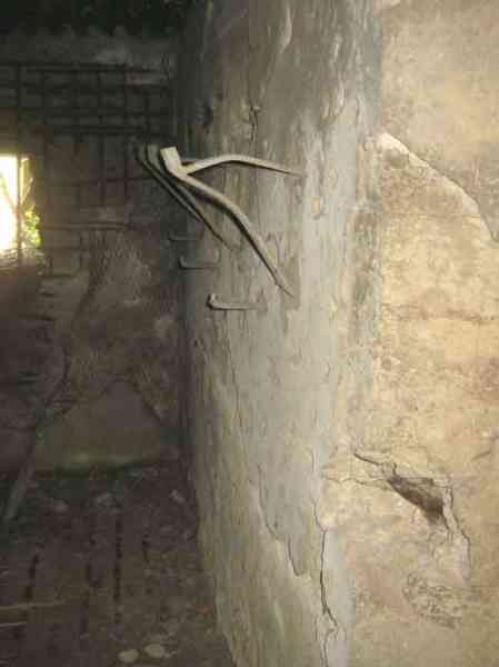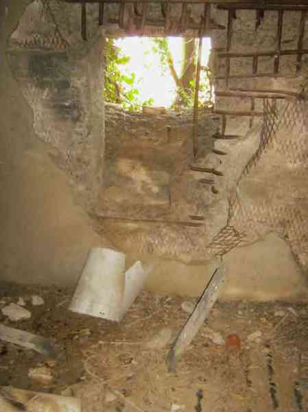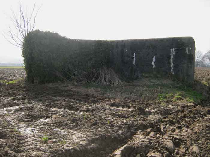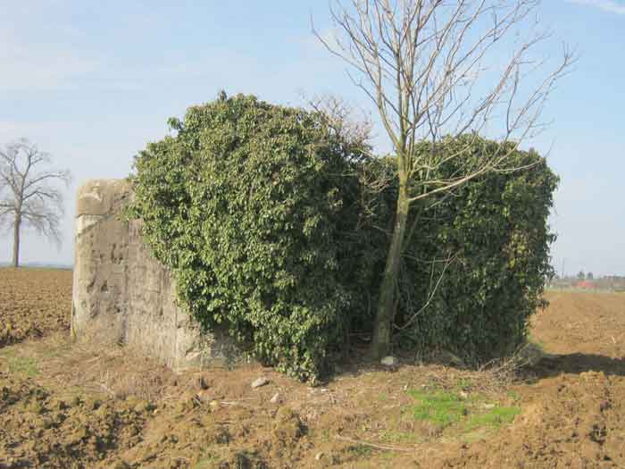 Belgian fortifications of the Second World War, Fortified Position of Liège, first resistance line, Neufchâteau-Visé sector, shelter NV19. NV19 is a shelter with two firing chambers. It is located in a meadow 125 meters from national road 627. One firing axis Mi 2 covered the road to Battice and the south of the village in a westerly direction. The embrasure is walled up but the hinges and attachments for the pivoting sealing flap are present; the other one, Mi 1, covered the direction of Warsage together with NV18. The embrasure is open. The covering earth has been removed. The exterior and interior have suffered significant damage. The entrance is open. The interior is partially complete. Two mount supports for Chardôme. A grenade launcher duct covers the entrance. Both embrasures are damaged. No more posts delimiting the military perimeter are present.