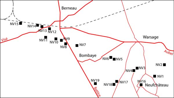 Belgische Festungen des Zweiten Weltkriegs, erste Verteidigungslinie, Intervall Neufchâteau-Visé (NV). Das Intervall Neufchâteau-Visé zählt 19 Unterstände, von NV1 bis NV19, ohne Unterbrechung, auf zwei Verteidigungslinien. Darunter befinden sich die beiden westlichen Beobachtungsstellen des Forts Aubin-Neufchâteau, der Unterstand NV 2 und der Unterstand NV 5. Alle wurden identifiziert und lokalisiert.