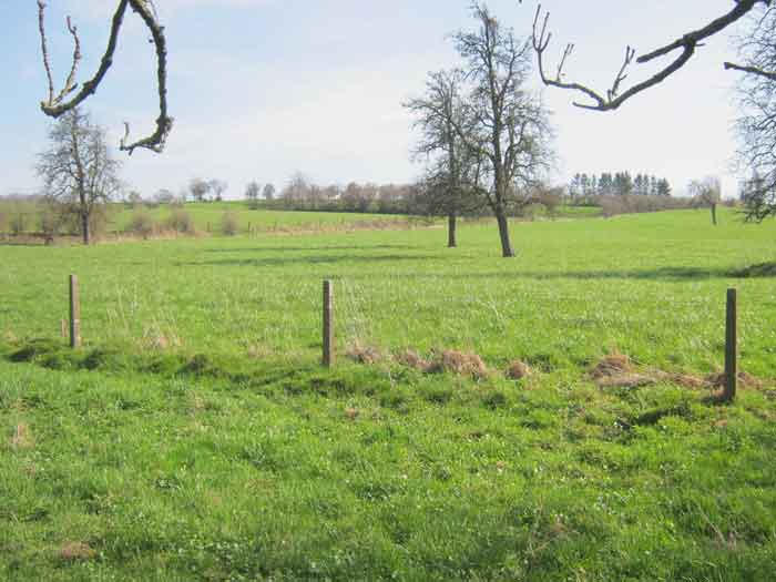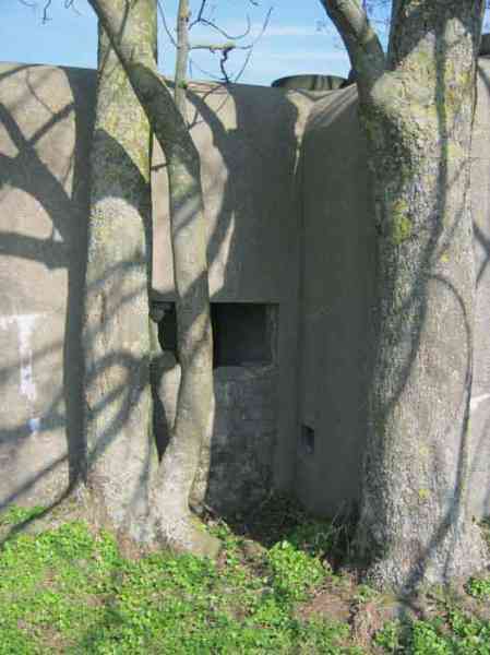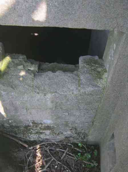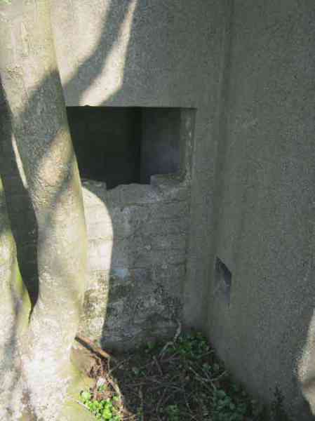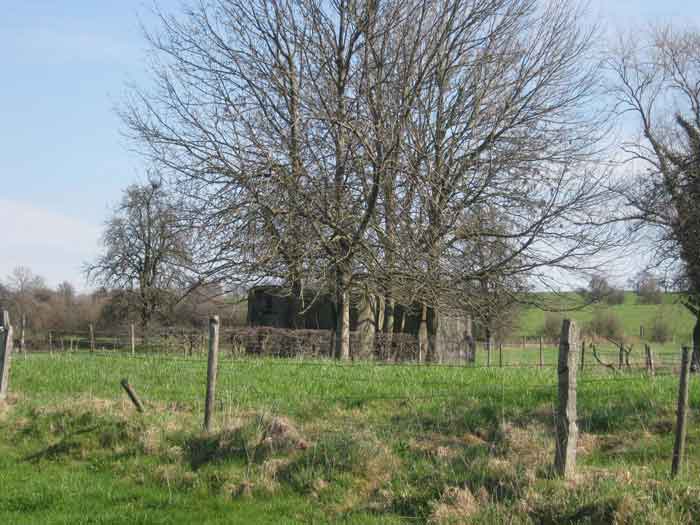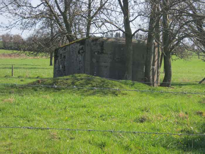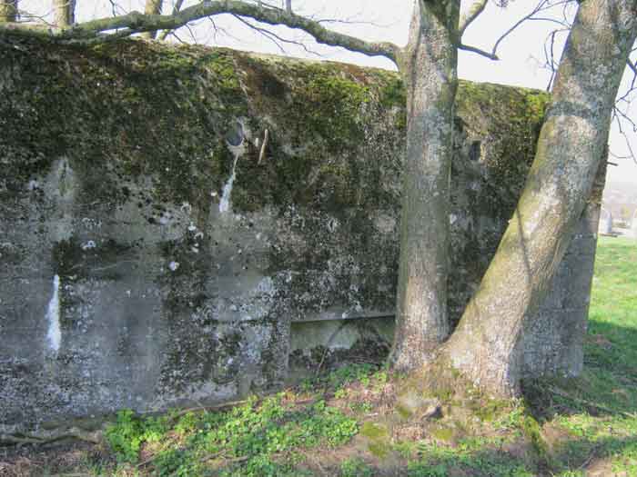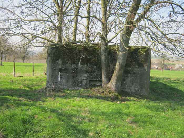 Belgian fortifications of the Second World War, fortified position of Liège, first resistance line, Neufchâteau-Visé interval. NV 1 is located in a meadow in Afnay. It covered the path descending from Fort Aubin-Neufchâteau. The embrasure is walled up. NV 1 had a facing wall as camouflage and steel rods are still present. Access is rather difficult. The interior is in good condition and complete. FRC mount, of which only the threaded rods remain. A grenade launching chute, the closing flap of which has disappeared, defended the entrance. Two DN boundary stones (National Defense) are still visible.