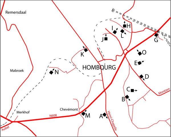 Ahead (to the East) of PFL1, 9 advanced positions were to serve mainly as an alert line while watching for incursions by isolated elements. Consisting of shelters of 3 x 3 m in reinforced concrete 80 cm thick with a frontal embrasure for a machine gun, this line was not capable of really delaying a major offensive. The shelters did not provide mutual cover and to our knowledge they were not occupied on the morning of May 10, 1940, the border guards, constituting the interval troops, had indeed received the order to entrench themselves behind the Albert Canal. The line extended from de Beusdael to Stavelot via Hombourg, Henri-Chapelle, Grunhault, Dolhain, Jalhay, Hockai and Malmedy.