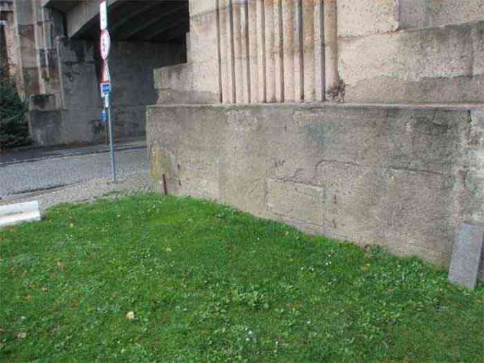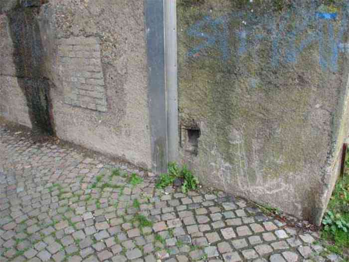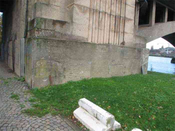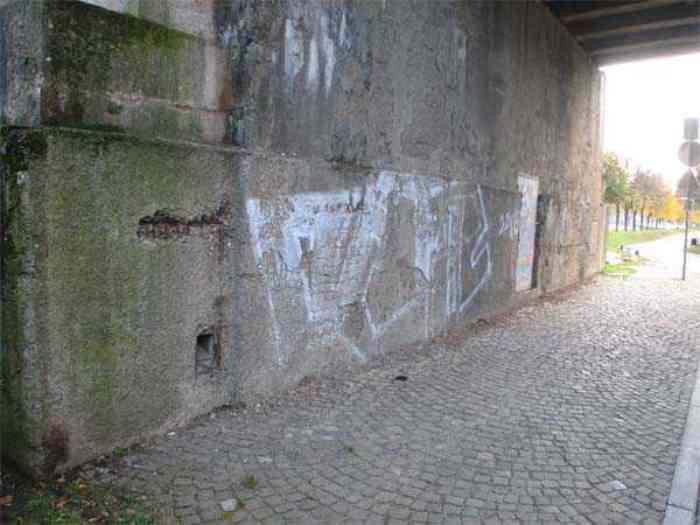 Fortified Position of Liège, fourth line of resistance, interval shelters, Pontisse-Lixhe interval or Meuse line, shelter PL 7, 56 m/asl. Located in the left bank pier of the bridge that crosses the Meuse at Visé. This is a sizeable shelter with two embrasures firing upstream (south) and two others firing downstream (north). The entrance is at the edge of the towpath and is defended by two grenade launcher chutes. Interior condition and layout unknown.