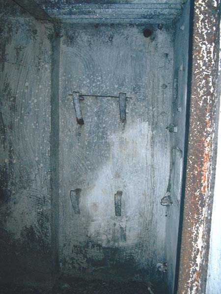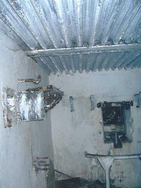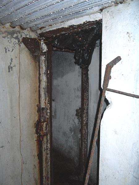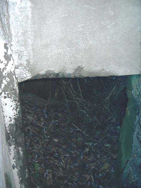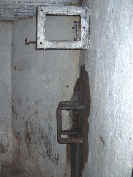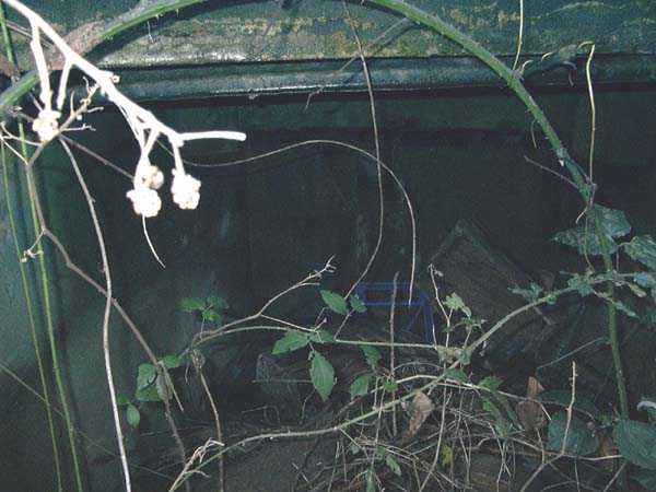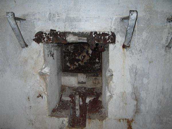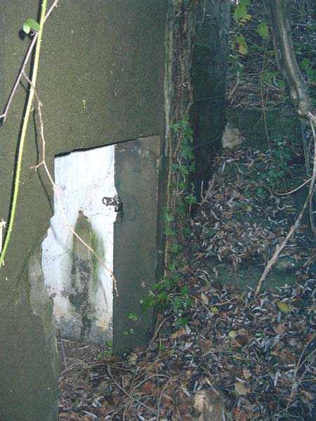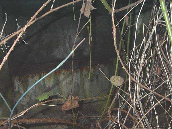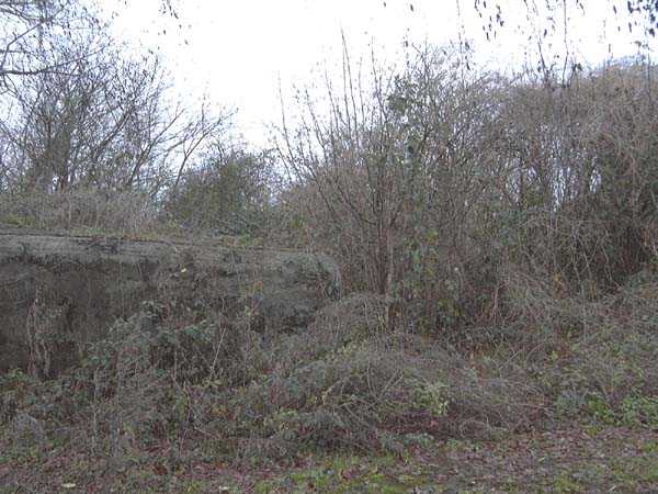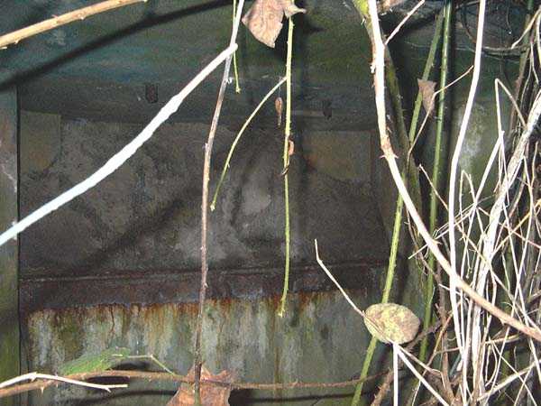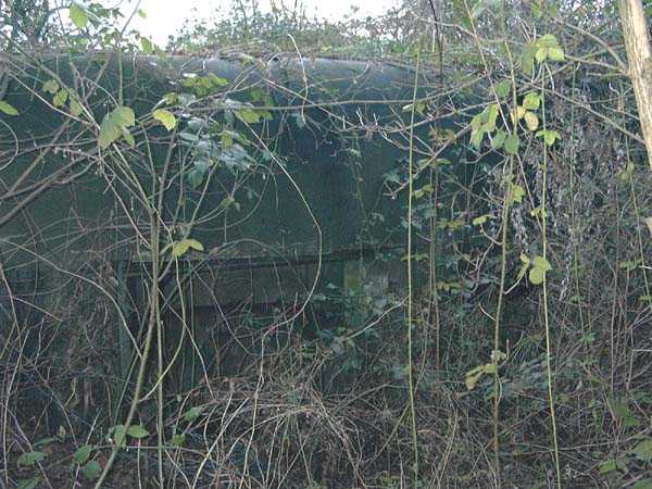 Fortified Position of Liège, fourth line of resistance, interval shelters, Pontisse-Lixhe interval or Meuse line, shelter PL 13, 111 m/asl. On the southeastern edge of the N671 road, Rue du Roi Albert at the entrance to Oupeye coming from Haccourt, it is completely buried under thorny bushes. Daniel was able to hack his way through with a machete in January to discover a fine FPL2 type interval shelter with two embrasures with Chardôme mount support for machine guns, one of which modified into a grenade launcher chute, and the addition of a GFM cupola (lookout and light machine gun) on the roof. Given the difficulty of access, this shelter is particularly well preserved and contains practically all its original metallic elements. Thus one finds the P1 entrance gate, the frame of the P2 louvered door and its hinges, the shelf consoles with the shelves, the L2 hooks for personal equipment, the L3 hooks for the individual weapon, the shelf with its fixing for the cartridge funnel, the rungs leading up to the now torn-off cupola, the acoustic tubes with their funnels and a good part of the forced ventilation. Only the fan, the P2 louvered door and, of course, the weapons are missing.