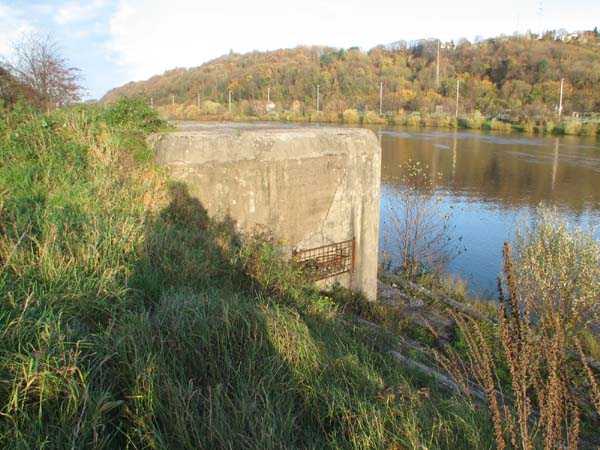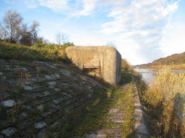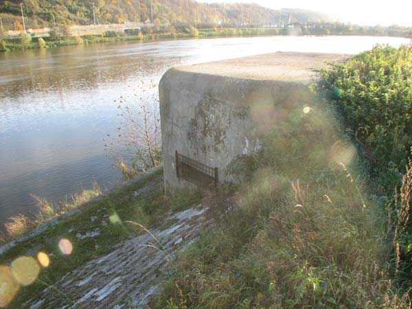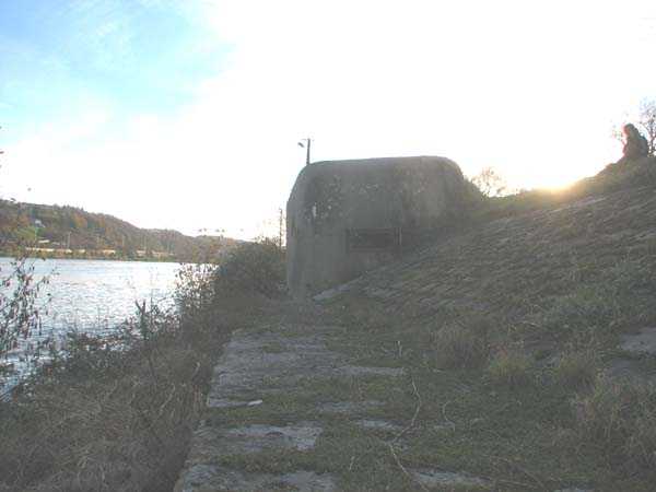 Fortified Position of Liège, fourth line of resistance, interval shelters, Pontisse-Lixhe interval or Meuse line, shelter PL B, 57 m/asl. This shelter prevented the crossing of the Meuse at Hermalle, at the level of the Chertal plant. It is located on the lower towpath and was accessible via the upper towpath. It had a machine gun embrasure firing upstream and a machine gun embrasure firing downstream which crossed its fire with the upstream embrasure of shelter PL C. Currently (11/2006), both embrasures are barred and the entrance is walled up.