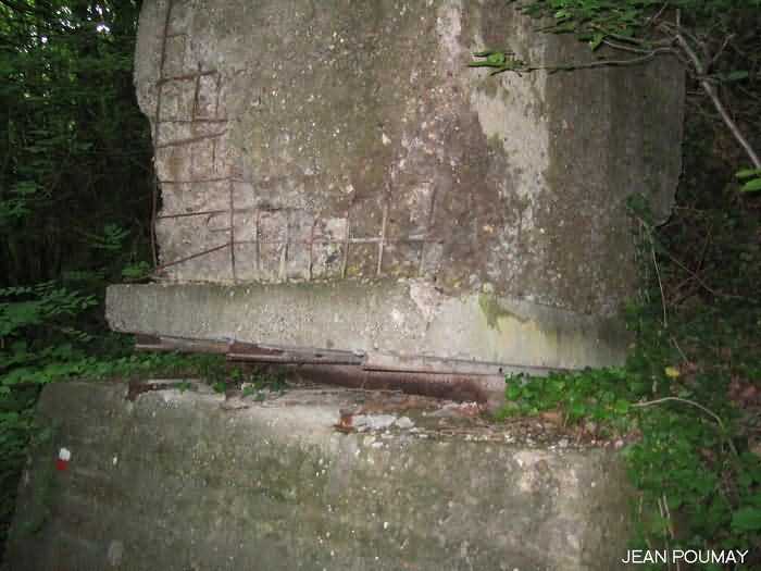 Fortified Position of Liège, second line of resistance, advanced post of Magnée, obstruction of Trixhe des Vignes, 158 m/asl. Located on the communal road named Rue "Sur Les Heids", 975 m southeast of shelter Mg3, not far from the gravel pit but on the other side of Rue du Bay Bonnet, it visibly consists of a reinforced concrete block of about 1 m³ deeply anchored on each side of the road, leaving a passage 3 meters wide that can be closed with metal beams and difficult to bypass due to the large trees surrounding it. We found no shelter defending the roadblock.