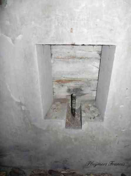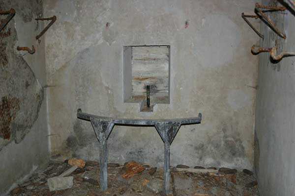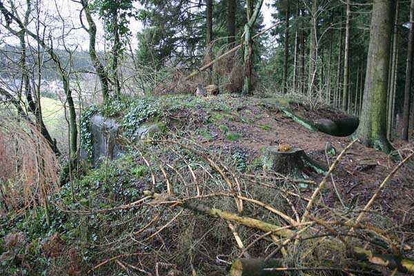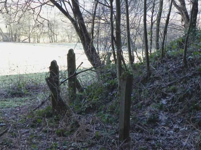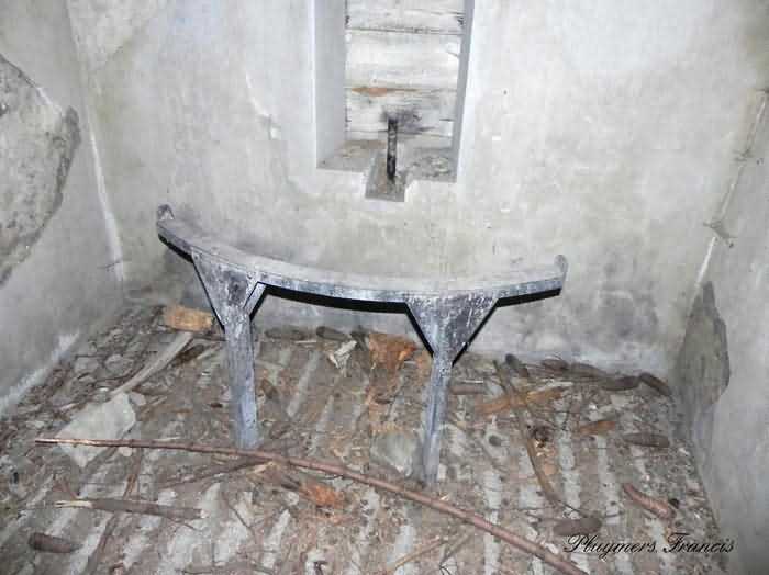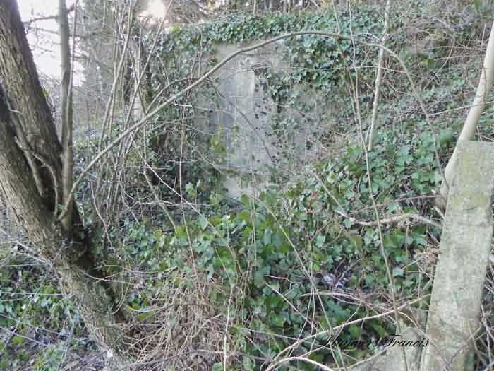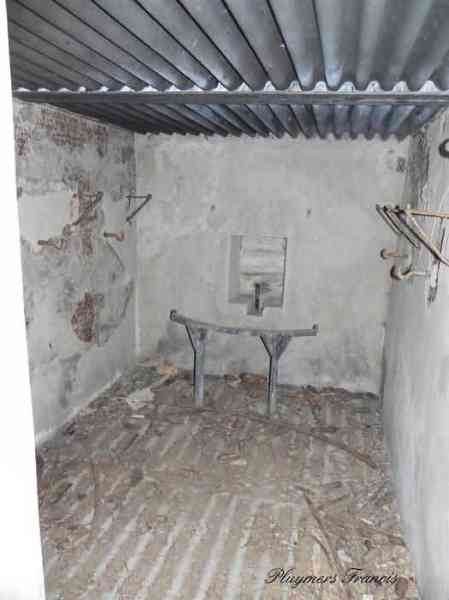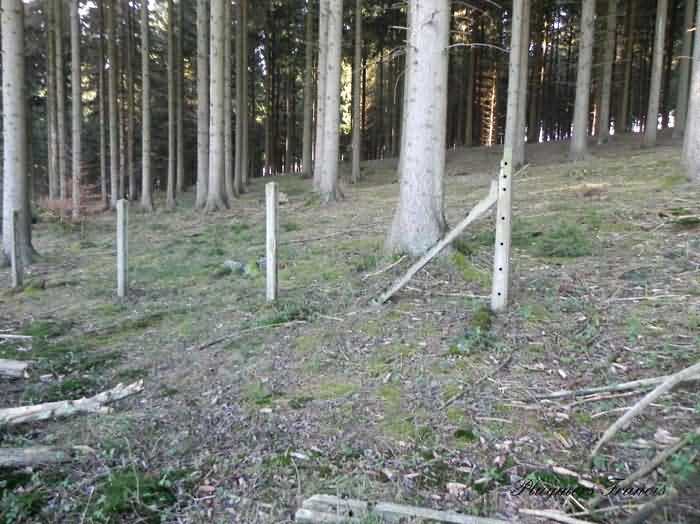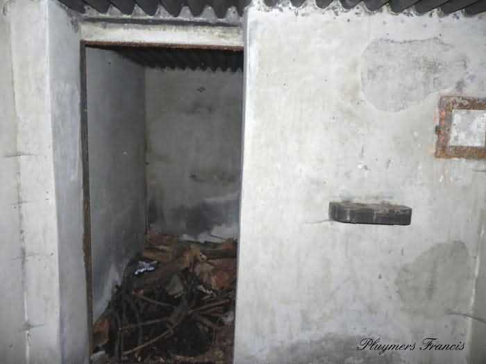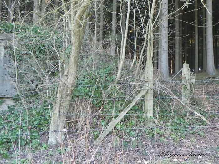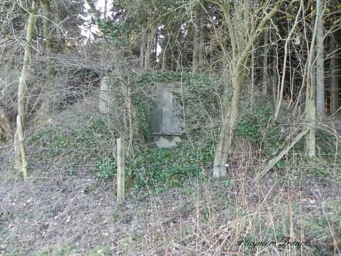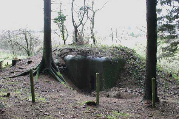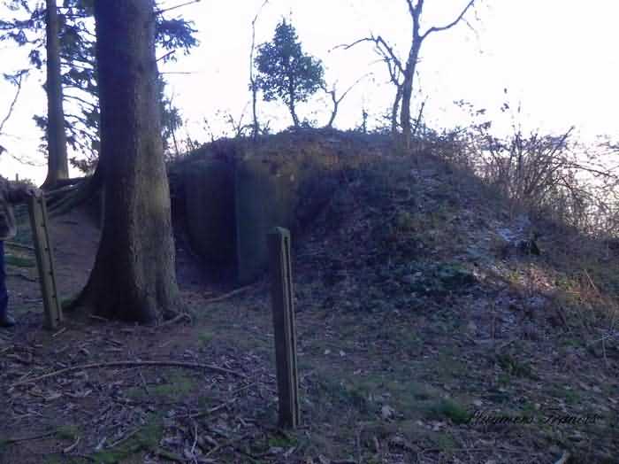 Belgian fortifications of the Second World War, Fortified Position of Liège, first line, Sougné-Becco interval, shelter SB1 with an embrasure for a Maxim machine gun on a sleigh mount and Chardôme device. On the edge of the woods, 265 meters north of the N697 road to Remouchamps and 600 meters west of the center of the locality of Hauregard, it is still in good condition. One can still find the consoles for the shelves, the service hooks, the support of the Chardôme mount and its pivot, the mounting plate for the cartridge hopper and the fixing hooks for the lighting. Outside remain concrete posts and the barrier of the original fence as well as traces of paint that camouflaged the shelter.
