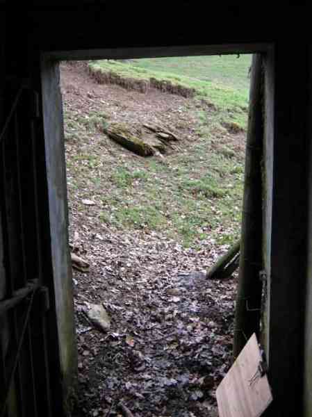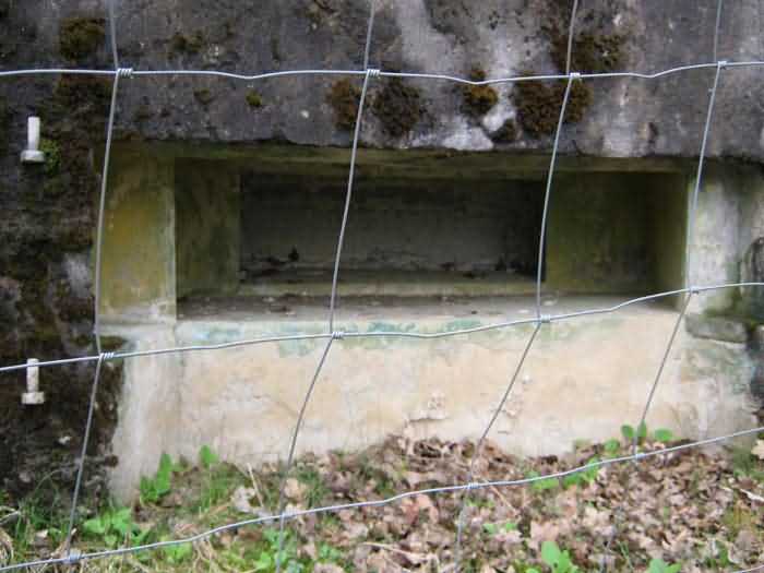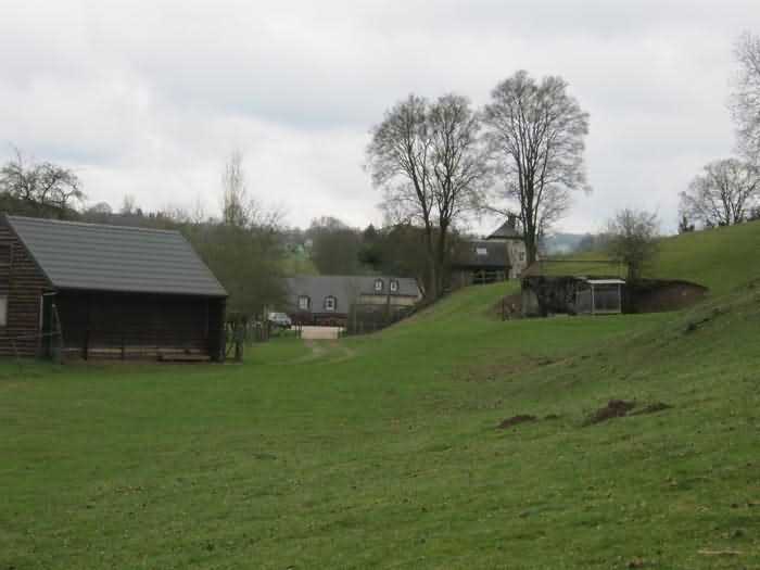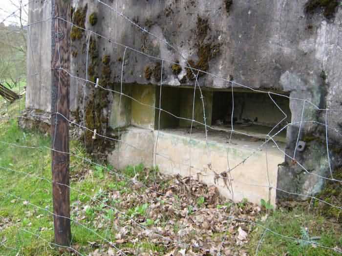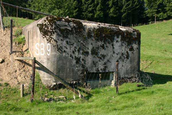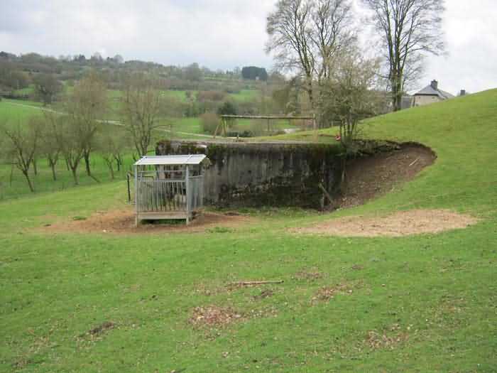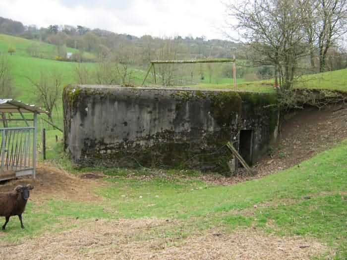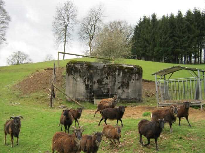 Fortifications belges de la deuxième guerre mondiale, position fortifiée de Liège, première ligne défensive, intervale Sougné-Becco, abri SB9 avec une embrasure pour une mitrailleuse Maxim sur affût traineau et dispositif Chardôme. Il est situé dans la propriéte d'une ancienne ferme transformée en gîte. La propriètaire, très sympatique, m'a laissé aller voir l'ouvrage sans problème, mais faire attention de bien fermer les barrières pour que les chèvres ne s'évadent pas. L'extérieur de SB9 est en bon état, l'intérieur aussi. Les deux portes y sont toujours, mais c'est une bergerie.