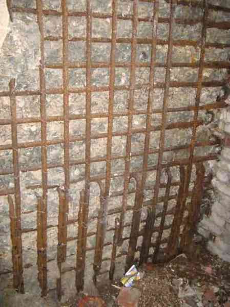 Belgian fortifications of the Second World War, Fortified Position of Liège, first line of defense, Sougné-Becco interval, shelter SB-A with a walled embrasure for a Maxim machine gun on a sleigh mount and Chardôme device. Located on the northern edge of Rue Vertfontaine, approximately halfway between Rue du Talbot and shelter SB4. Structurally damaged and revealing the reinforcement mesh over a large area, one can still find the concrete posts that delimit the military area, the consoles for the shelves, the service hooks, one of the two lighting hooks, the door hinges and frames as well as the flap of the grenade launcher and the complete support for the cartridge hopper. The doors and the Chardôme circular mount have disappeared.