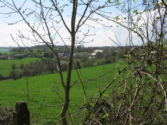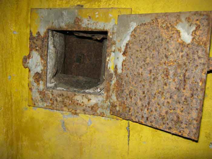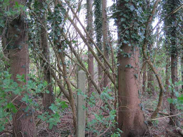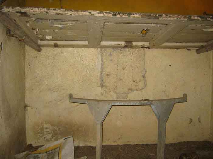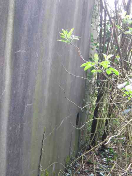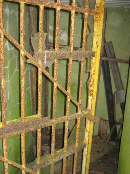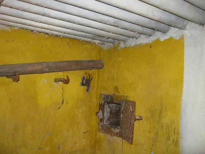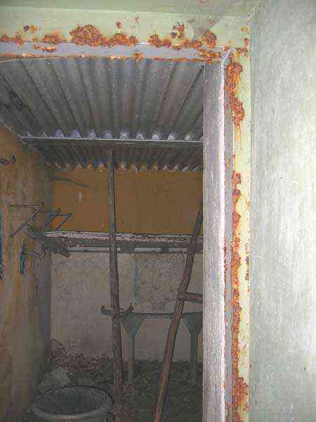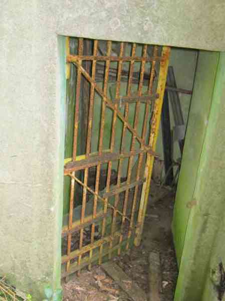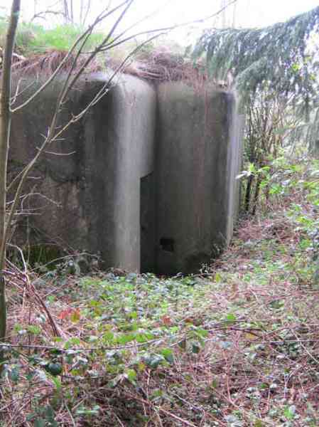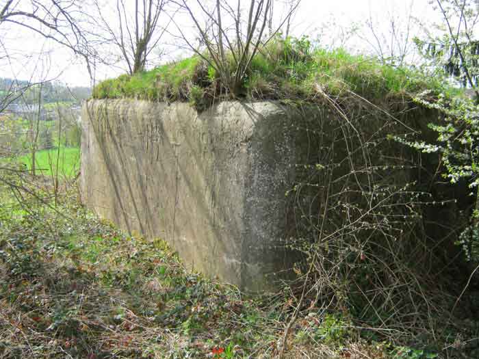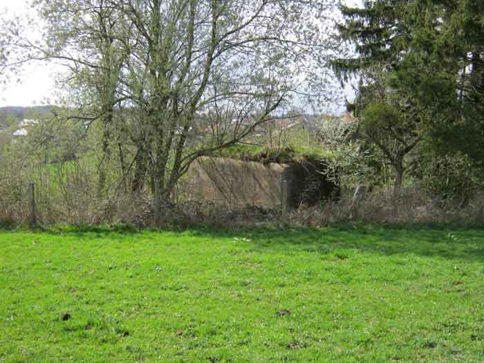 Belgian fortifications of the Second World War, first line of defenses, Sougné-Becco interval, shelter D. Structure located 50 m south of the Becco–Spixhe road, 210 m east of shelter SB C. The exterior is in good condition and served as a storage room. It is still surrounded by its hedge and its concrete fence posts. Inside, one finds its grille PA, the hinges and frame of door P2, the consoles for the shelves, the service hooks, the flap of the grenade-launching chute and the circular Chardôme support for the sleigh mount of the Maxim machine gun. The embrasure is walled up.
