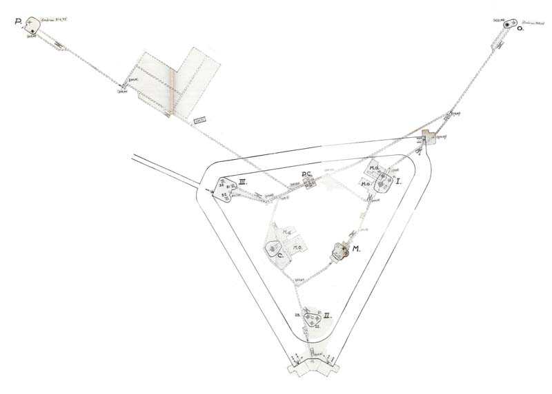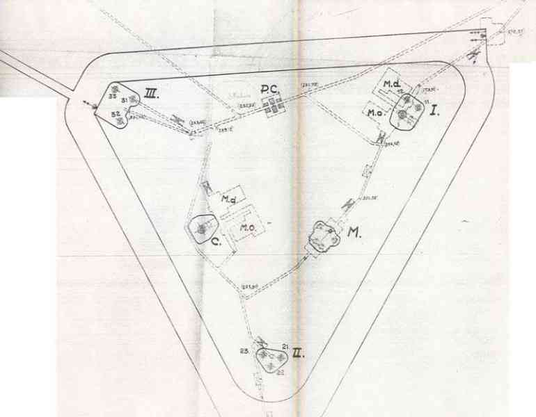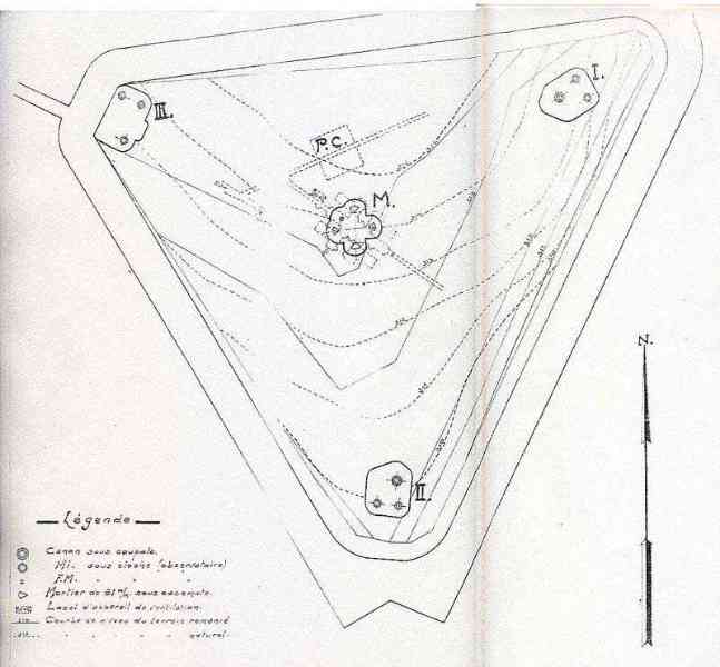 Belgian fortifications of the Second World War, fortified position of Liège, first line of resistance, fort of Sougné-Remouchamps. For this fort, at least four projects, from a triangular fort with a non-flanked double coffre, will have been drawn on paper. It could have included an interesting mortar block with four embrasures but budget restrictions put an end to the ongoing works. The geological surveys will be carried out and at least one shaft will have been drilled. It remained at the project stage without follow-up.