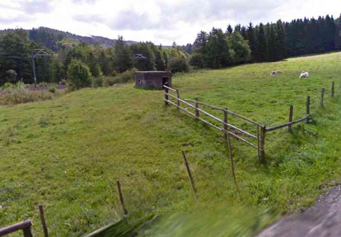 Belgische Festungen des Zweiten Weltkriegs, befestigte Stellung Lüttich, erste Widerstandslinie, südliches Ende, vorgeschobene Stellung von Trois-Ponts / Salm, S1-Unterstand vom Typ PA Modell C, 323 M/ü. M., 3 Mann, 1 Maschinengewehr auf Chardôme-Lafette. Zwischen der Eisenbahnstrecke und der rue de Raines in Richtung des Weilers Bécharprez gelegen, verteidigt er einen Süd-Südost-Sektor, der die Eisenbahnstrecke und teilweise die N68 zur Hostellerie des Linaigrettes abdeckt. Seiner metallenen Elemente beraubt, ist er strukturell in gutem Zustand.