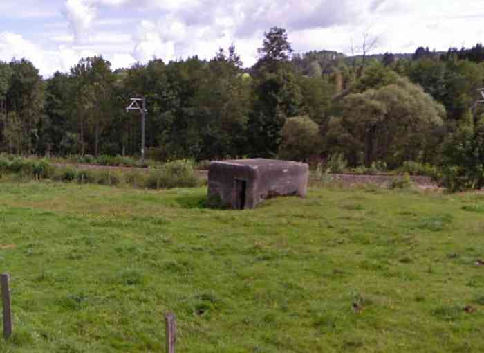 Belgian fortifications of the Second World War, fortified position of Liège, first line of resistance, southern end, advanced position of Trois-Ponts / Salm, S1 shelter of type PA model C, 323 m/asl, 3 men, 1 machine gun on Chardôme mount. Located between the railway line and the rue de Raines towards the hamlet of Bécharprez, it defends a south-south-east sector covering the railway line and partly the N68 road towards the Hostellerie des Linaigrettes. Stripped of its metal elements, it is structurally in good condition.