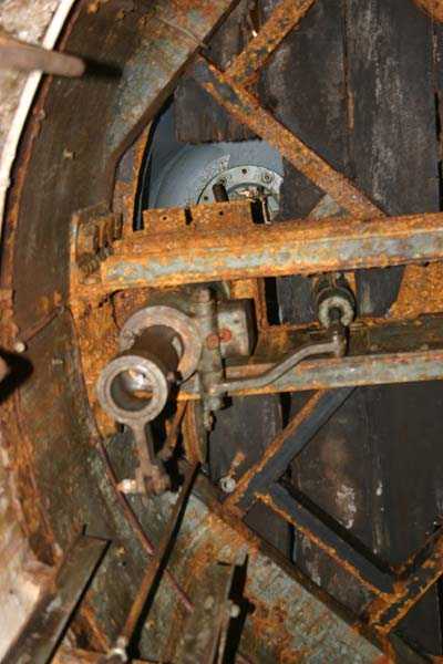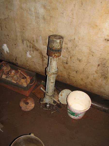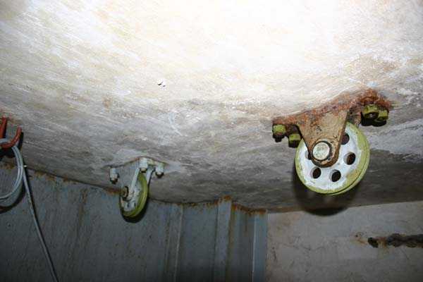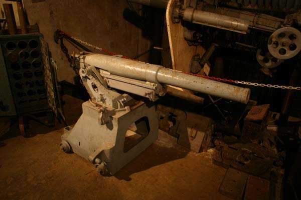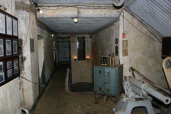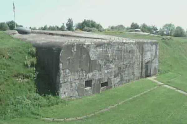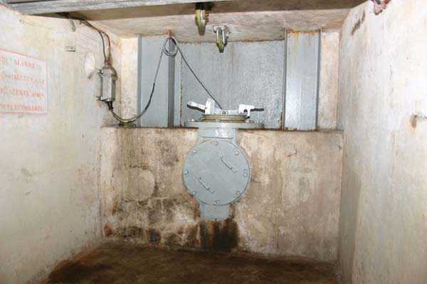 Belgian fortifications of the Second World War, fortified position of Liège, first line of resistance, fort of Tancrémont. The access block, an infantry casemate embedded in the scarp, is built on the same model as that of Fort Aubin-Neufchâteau, with the difference that it has only one machine gun cupola on the roof instead of three for Aubin, that the staircase allows the passage of longer objects but above all that it has preserved the vast majority of its equipment. On the facade and from left to right: the embrasure of the armored 30 cm searchlight intended to illuminate the entrance bottleneck and slightly offset from it to avoid direct hits; the embrasure for the Maxim machine gun on a reversible mount in the axis of the entrance bottleneck; two 12 cm tubes to throw fragmentation hand grenades of the Mills type; the entrance of the block closed by a heavy two-leaf gate. At the roof edge and 3 meters from the base of the block, a row of metal hooks is intended for the fixing of camouflage nets in order to modify the external appearance of the construction so that any aerial photographs do not reveal the configuration and armament. In the entrance, a retractable bridge reveals a 4-meter-deep ha-ha. At the back of the entrance, an embrasure for a light machine gun defends the access to the gate and a hand grenade chute protects this embrasure. At the end of the entrance corridor and on the left, a double airtight door allows the block to be isolated from the outside world and pressurized. Beyond this door, on the right, are the guardhouse and the operating room of the retractable bridge as well as the access ramp to the elevator. Opposite, the staircase that allows access to the lower level, to the twin machine gun cupola on a reversible mount and to the decontamination rooms. The entrance block BI has no basement.