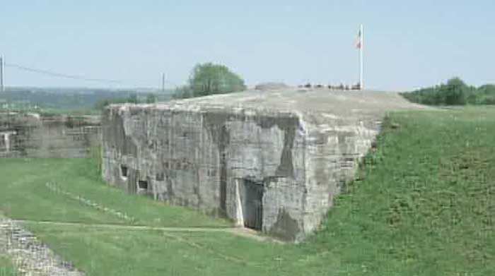 Belgische Befestigungen des Zweiten Weltkriegs, befestigte Stellung Lüttich, erste Widerstandslinie, Fort von Tancrémont. Der Zugangsblock, eine in die Eskarpe eingelassene Infanteriekasematte, ist nach demselben Modell wie der des Forts Aubin-Neufchâteau gebaut, mit dem Unterschied, dass er nur eine Maschinengewehrglocke auf dem Dach hat statt drei bei Aubin, dass die Treppe den Durchgang längerer Objekte erlaubt, aber vor allem, dass er den Großteil seiner Ausrüstung erhalten hat. An der Fassade und von links nach rechts: die Scharte des gepanzerten 30-cm-Scheinwerfers zur Beleuchtung der Engstelle des Eingangs und leicht versetzt zu dieser, um direkte Treffer zu vermeiden; die Scharte für das Maxim-Maschinengewehr auf schwenkbarer Lafette in der Achse der Engstelle des Eingangs; zwei 12-cm-Rohre zum Werfen von Splitterhandgranaten des Typs Mills; der Eingang des Blocks, verschlossen durch ein schweres zweiflügeliges Gitter. Am Dachrand und 3 Meter von der Basis des Blocks entfernt dient eine Reihe metallischer Haken der Befestigung von Tarnnetzen, um das äußere Erscheinungsbild des Bauwerks zu verändern, damit eventuelle Luftaufnahmen die Konfiguration und Bewaffnung nicht preisgeben. Im Eingang legt eine versenkbare Brücke einen 4 Meter tiefen Haha-Graben frei. Am Ende des Eingangs verteidigt eine Scharte für ein leichtes Maschinengewehr den Zugang zum Gitter, und ein Handgranatenwurftrichter schützt diese Scharte. Am Ende des Eingangskorridors links ermöglicht eine doppelte luftdichte Tür, den Block von der Außenwelt zu isolieren und unter Druck zu setzen. Hinter dieser Tür findet man rechts die Wachstube und den Bedienungsraum der versenkbaren Brücke sowie die Auffahrt zum Aufzug. Gegenüber die Treppe, die den Zugang nach unten, zur Doppel-Maschinengewehrglocke auf schwenkbarer Lafette und zu den Entgiftungsräumen ermöglicht. Der Eingangsblock BI hat keinen Untergrund.