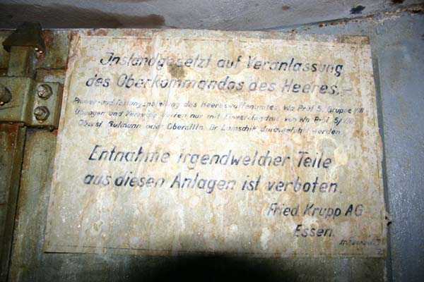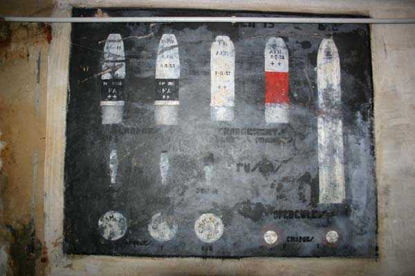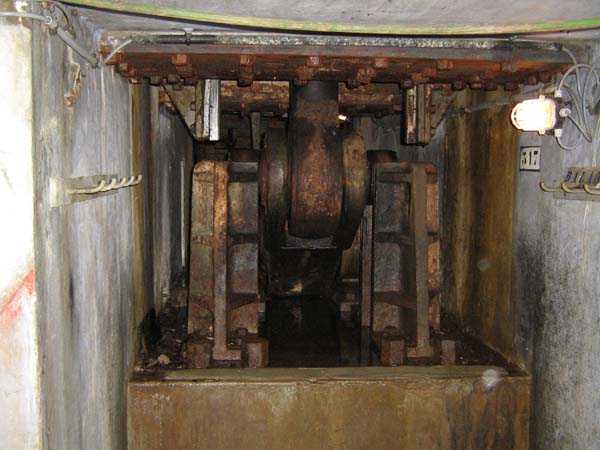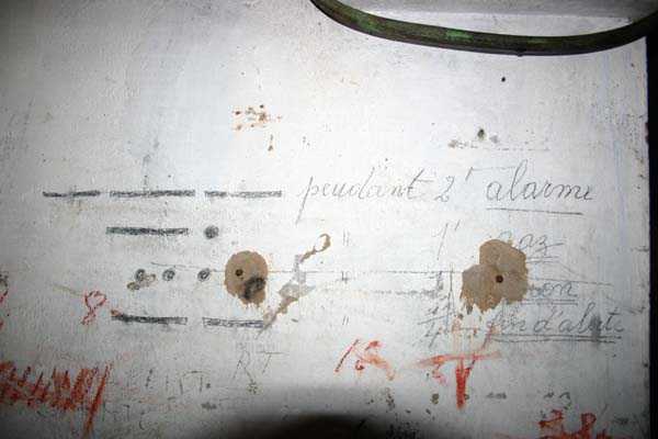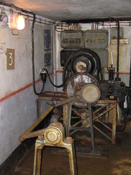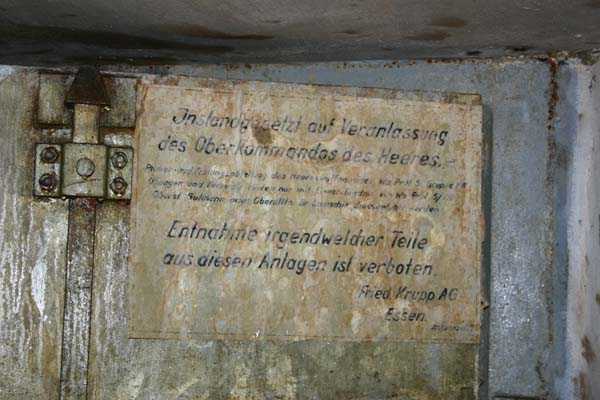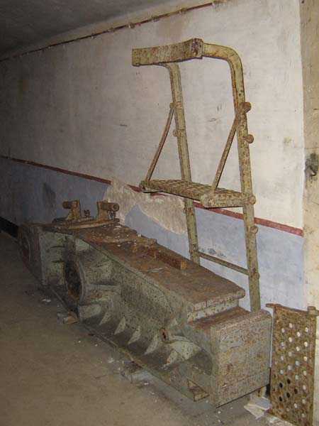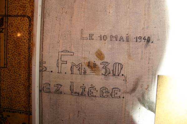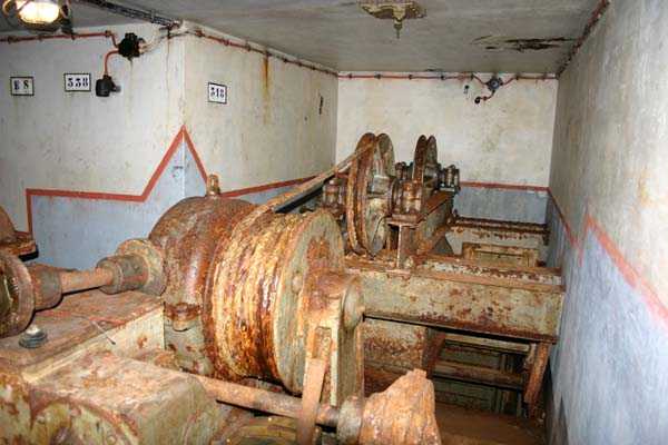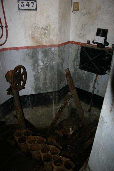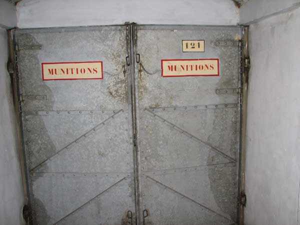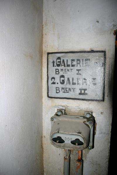 Belgische Befestigungen des Zweiten Weltkriegs, befestigte Stellung Lüttich, erste Widerstandslinie, Fort von Tancrémont. Der Artillerieblock II ist mit einem einziehbaren/versenkbaren Geschützturm für 2 Geschütze 75 mm mit einer Reichweite von etwa 11 Kilometern ausgestattet. Jedes Geschütz ist mit 2000 Geschossen ausgestattet. Das Feuer wird durch die Feuerleitstelle kommandiert, kann aber auch direkt durch das zwischen den beiden Geschützen befindliche direkte Zielvisier erfolgen. Das Foto zeigt, dass der Mantel des Turms um etwa 5 Zentimeter verdünnt wurde. Die dadurch erreichte Gewichtsreduzierung macht den Turm jedoch verwundbarer. Der Block ist typisch konstruiert. Man findet ihn im Fort von Aubin-Neufchâteau mit unverdünntem Mantel und im Fort von Battice mit einem unverdünnten Mantel von 5 Zentimetern. Die Turmblöcke (Nordkuppel und Südkuppel) des Forts Eben-Emael haben ebenfalls einen verdünnten Mantel, aber von 10 Zentimetern, und bieten andere Besonderheiten wie einen Infanterieausgang oder Scharten zur Flankierung der Gräben des Werks. Der Block verfügt außerdem über zwei Glocken für ein Doppel-Maschinengewehr Maxim auf schwenkbarer Lafette. Die Glocken dienen der Nahverteidigung des Werks. Derzeit konnte der Hebe- und Senkmechanismus restauriert werden. Es ist somit wieder möglich, den Turm zu heben und zu senken. Die beiden Geschütze wurden ebenfalls funktionsfähig gemacht, und bei jeder Gedenkfeier am 10. Mai 1940 werden Platzpatronenschüsse abgefeuert. Die Drehbewegungen sind noch blockiert und werden noch viele Stunden Arbeit in Reinigung und Schmierung der mechanischen Teile erfordern.