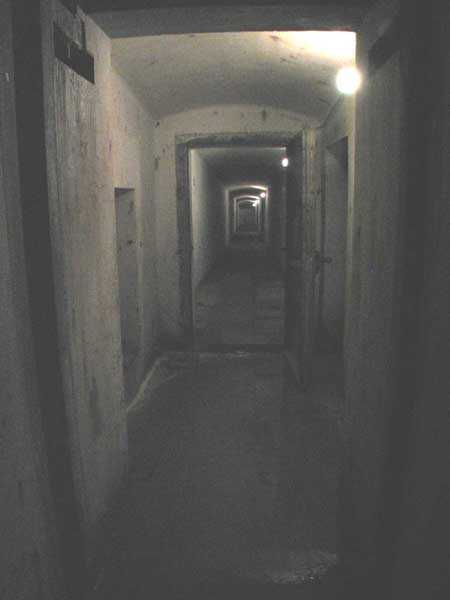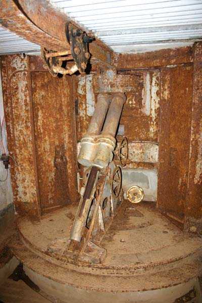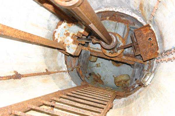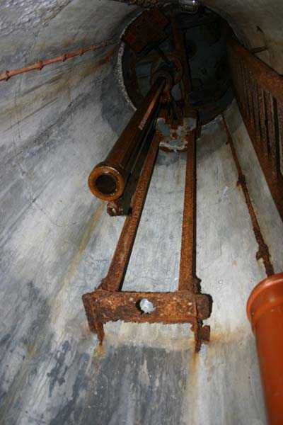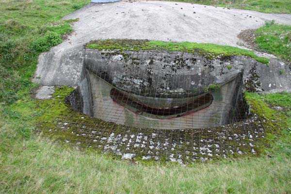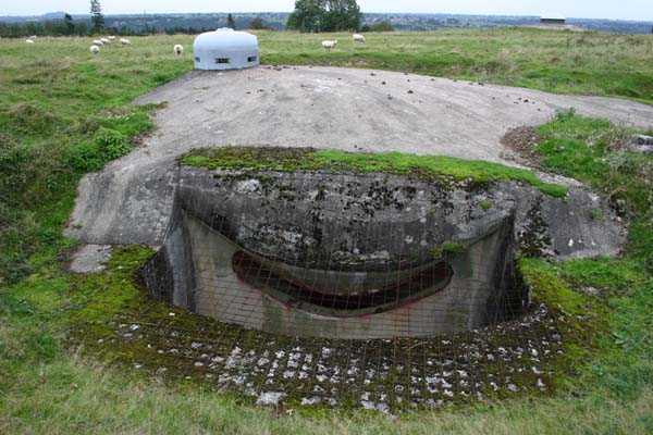 Belgian fortifications of the Second World War, fortified position of Liège, first line of resistance, fort of Tancrémont, BM. The mortar block exists in two copies with slight variations in emplacement and orientation of the weapons to conform to the terrain configuration. Its false twin is located at the centre of the massif of Fort Aubin-Neufchâteau. This type of combat block was unknown to the German troops, to whom it caused justified fear. Completely buried, except for the observation and light machine gun cupola with six closable embrasures (Sechschartenturm), it presented a particularly difficult target to hit. These three embrasures in a circular arc segment are buried inside a deep diamond ditch. The three French 81 mm mortars with which it is equipped can fire bombs at a range between 300 and 3600 metres at a rate of 20 rounds per minute per tube; the shells were supplied from three magazines and raised by three norias or Paternoster lifts. The BM therefore operates both in the close defence of the work and in the interdiction of distant valleys. It is under the control of the small arms fire control room.