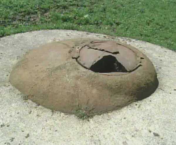Belgian fortifications of the Second World War, fortified position of Liège, first line of resistance, fort of Tancrémont, observatory and air intake BO. As promised last week, I returned to the site and took some photos of block O so that you can get a correct idea of it. Of the anti-tank and anti-personnel protections that surrounded the construction in May 1940, only a metal gate in very poor condition remains, which must be bypassed to reach the block after crossing two barbed wire fences at the risk of one's clothing. Block O has a dual purpose. It serves as an air intake through its telescopic tube of 60 cm in diameter that can draw fresh air from 18 metres above the ground. The photo shows that the tube's cover was partially cut with an oxy-cutting torch long after the war to allow passage to some vandal. The hole thus cleared, however, does not allow the passage of a child, even a small and skinny one. Block O also serves as an observatory through its GFM cloche (sentinel and light machine gun) with six closable embrasures that can be equipped with a VDP (direct and periscopic vision). It observes the entire Vesdre valley below and even has a view as far as the Vesdre observatory belonging to Fort Tancrémont, which is set back a little along the old road that connects Verviers to Liège through the valley. The last photo shows the block seen from the valley towards the fort.