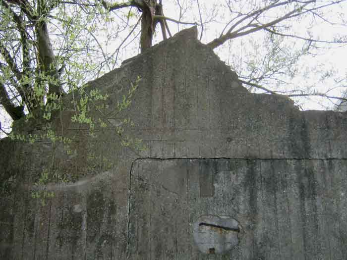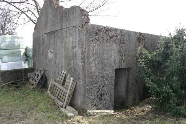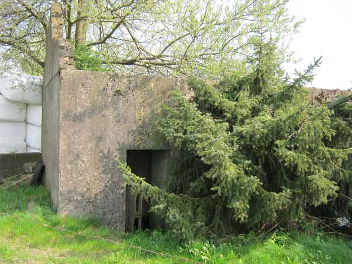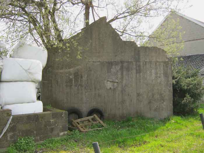 Belgian fortifications from the Second World War, fortified position of Liège, first line of resistance, interval Vesdre-Manaihant. VM 15 is located south of the Grand-Rechain road. It is 150 meters from VM 14 and crosses its fire with VM 16. It has a gable made of brick masonry and its camouflage allowed it to be confused with the neighboring farm. The exterior is in good condition. There remain a few stakes. The embrasure is walled up. FRC mount. The entrance is open but the structure serves as a shed for its owner. It also has, at shelf height, a numbering from 1 to 3 in Roman numerals.