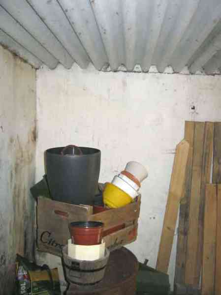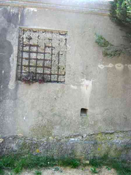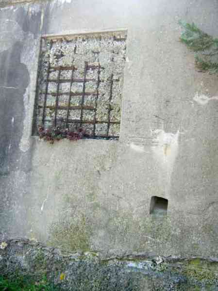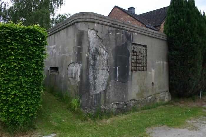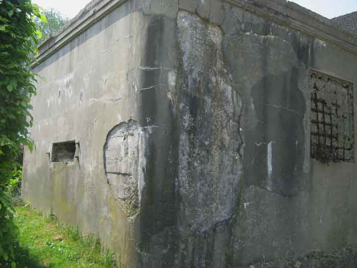 Belgian fortifications from the Second World War, fortified position of Liège, first line of resistance, interval Vesdre-Manaihant. VM 25, located on the edge of Avenue Henri Massin at the southeastern corner of the former football field but on the other side of the road. It enfiladed the road coming from Verviers. Camouflaged as a dwelling, it has a false window and a false flat roof. The embrasure with a pivoting shutter is closed. The structure is privately owned and serves as a shed for its owner. The exterior and interior condition is good. The FRC mount is in very good condition, only the wheel is missing to make it functional. The interior is complete. Two grenade launching chutes defended the surroundings. There are no fence stakes left.
