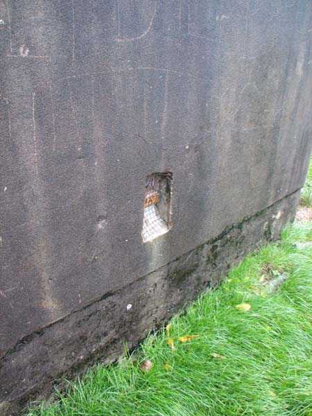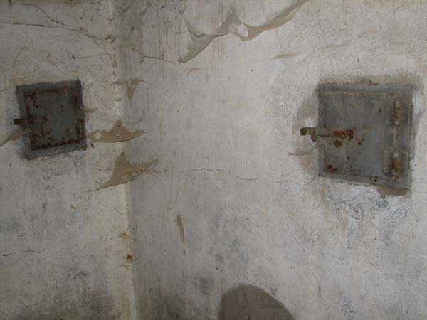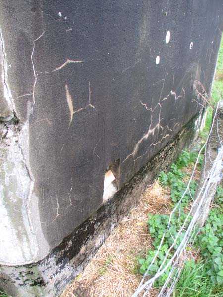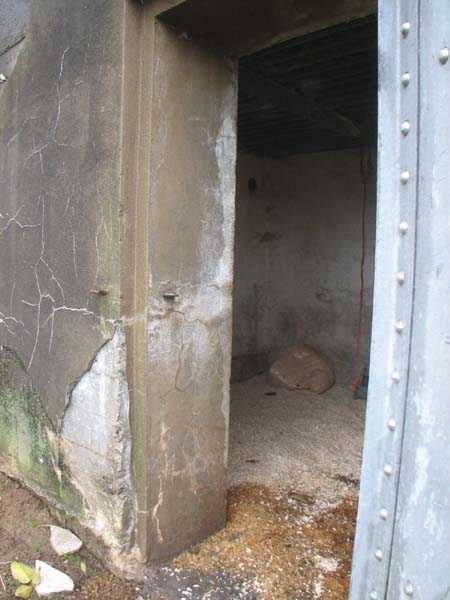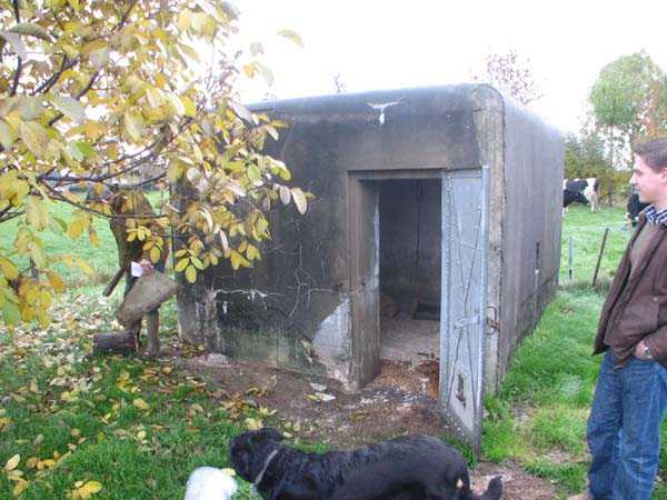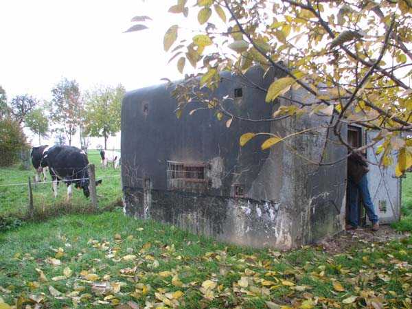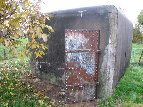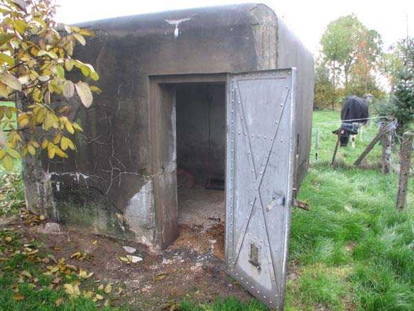Fortified Position of Liège, third line of resistance, bridgeheads, Visé bridgehead, shelter Vi4, 113 m/asl. Located in the western extension of Rue Porte de Lorette next to the Ferme du Temple. It is a reinforced type PA model C shelter. It still contains the closing flaps of the grenade launcher chutes and a sheet metal door that seems original but must come from another shelter and be mounted upside down, as its observation and rifle port is at knee height instead of head height. It is very well maintained by the farmer.
