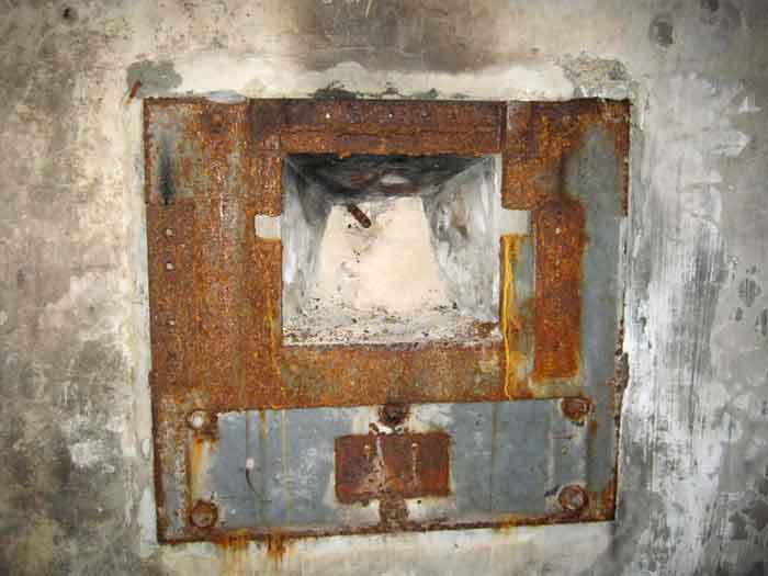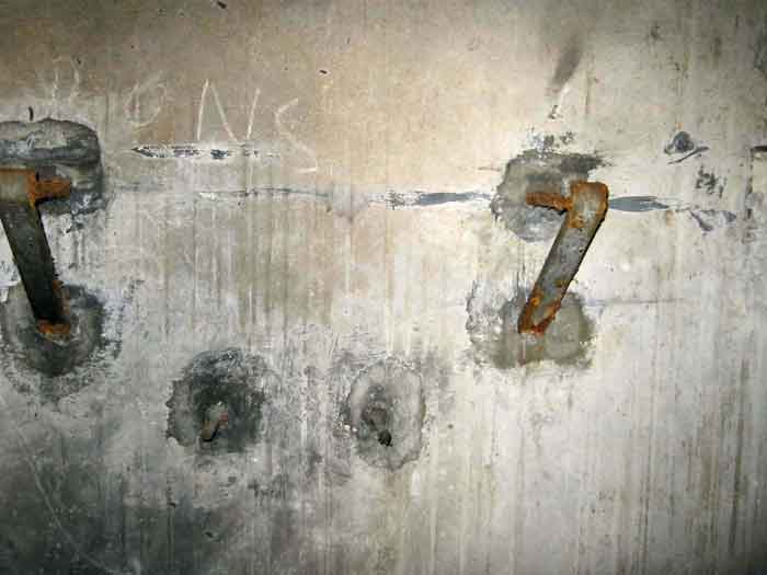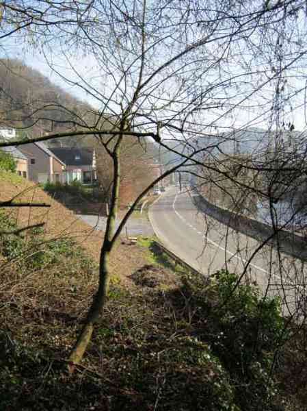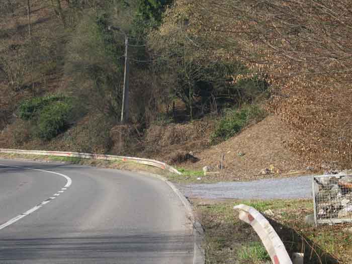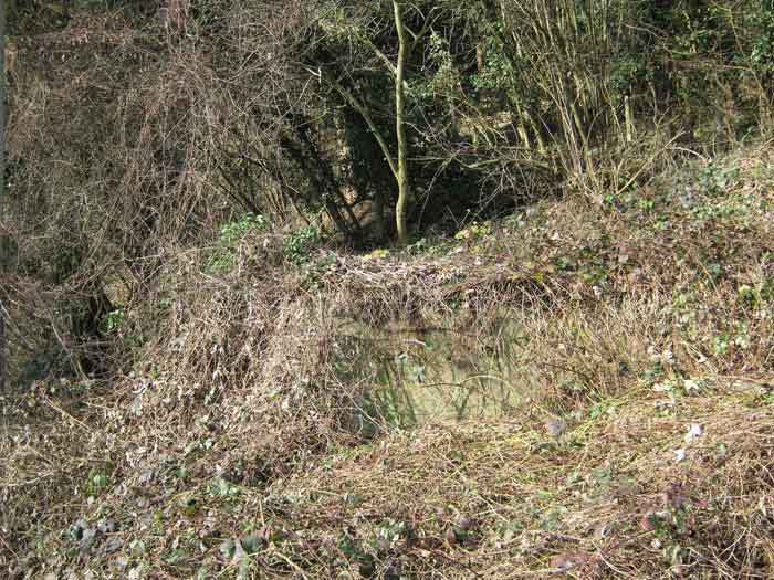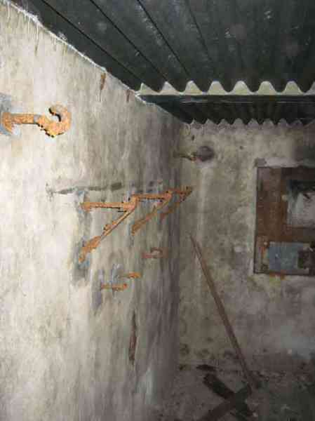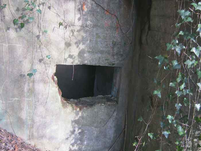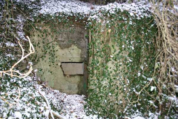 Belgian fortifications from the Second World War, fortified position of Liège, first line of resistance, interval Vesdre-Manaihant. VM 1 is located on the Liège-Verviers road in the bend at the exit of Pepinster opposite the former factory "Textile de Pepinster". It also covers this important communication route. It is covered with vegetation. It still has some of its concrete posts on the upper part of the shelter as well as at least one DN marker (National Defence). The external condition is difficult to assess due to the dense vegetation cover. The embrasure is walled up. The entrance is open. One finds there the hinges and attachments of the embrasure shutter, the hinges of the entrance grille P1, the frame and hinges of the louvered door P2, the brackets for placing the wooden shelves, the attachment of the hook L1 with the hook for the Coleman lamp, the hooks L2 for personal equipment, the hooks L3 for rifles, the tray for the cartridge hopper with its bent metal support and the very scant remains of an FRC mount. Among the missing items are most of the fence posts, DN markers (National Defence), the entrance grille P1, the louvered door P2, the closure flap of the grenade launching chute and the largest part of the mount for the Maxim machine gun.