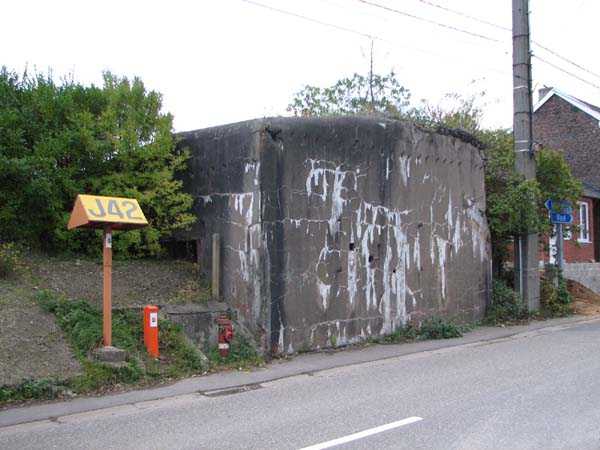 Befestigte Stellung Lüttich, dritte Widerstandslinie, Brückenköpfe, Brückenkopf Visé, Unterstand Vi11, 71 M/ü. M. Gelegen in der Rue de Maestricht in unmittelbarer Nähe der Eisenbahnbrücke und gegenüber der Rue d'Artagnan, handelt es sich hier um den vierten Gegenstoßunterstand des Brückenkopfes, einstöckiger Typ mit einer Schießscharte für eine 47-mm-Pak, einer Schießscharte für ein Maschinengewehr und einer Schießscharte für einen 30-cm-Scheinwerfer. Seine Deckenplatte trug eine Kuppel vom Typ GFM, die heute zum Verschrotten herausgerissen wurde. Im Inneren findet man noch zahlreiche metallene Elemente wie die Sprossen, die zur Kuppel hinaufführen, die Konsolen für die Regale, verschiedene Haken sowie einen Teil der Zwangsbelüftung. Im Außenbereich findet man noch einen der Betonpfähle, die das Militärgelände abgrenzten, und die Verankerungspfähle für die Seile und Cointet-Barrieren der Panzersperre. Er hat einen bösen Schlag an der Stelle abbekommen, wo sich die Kuppel befand.