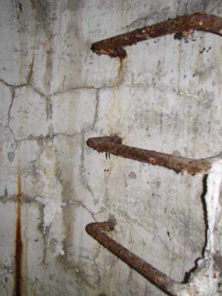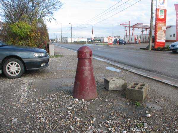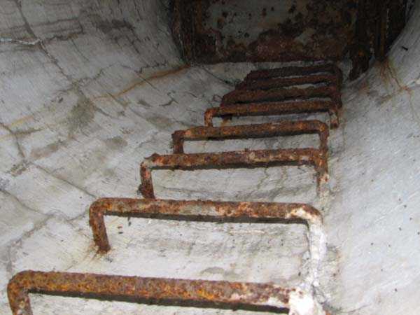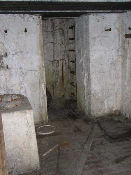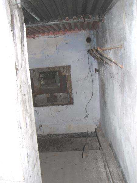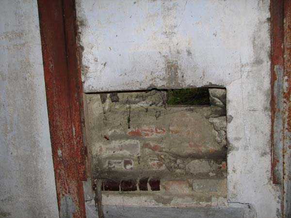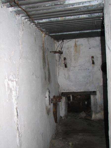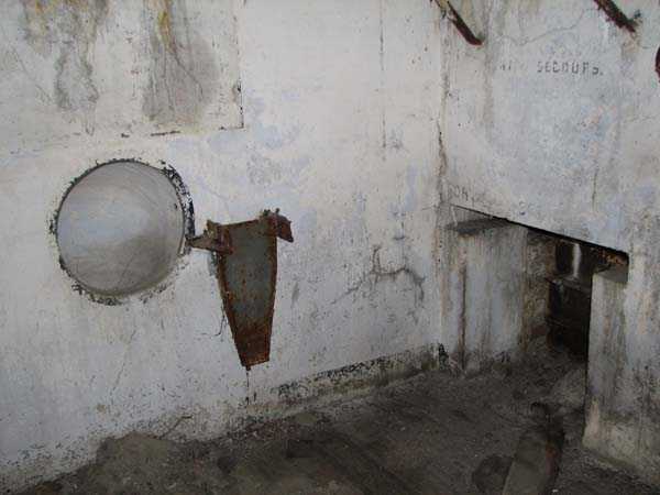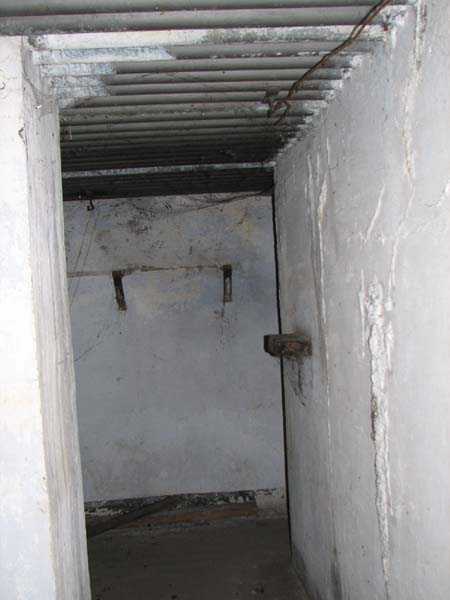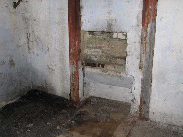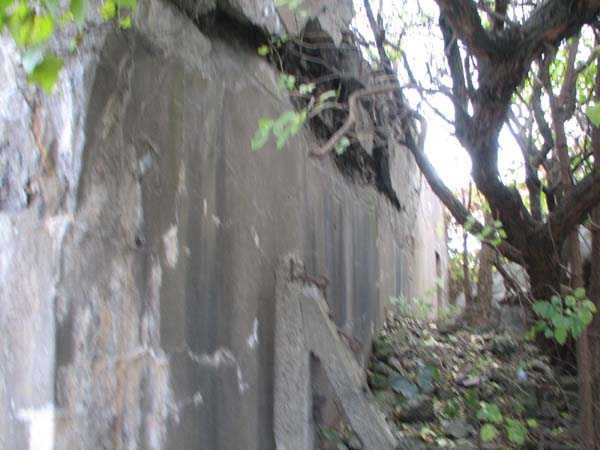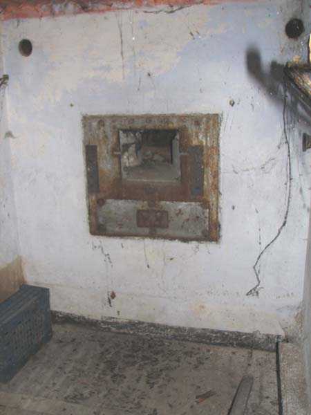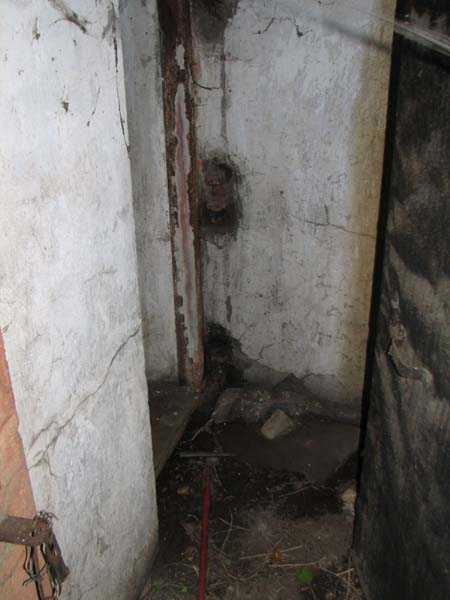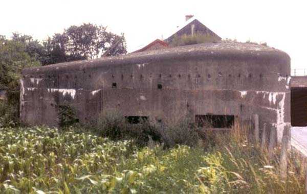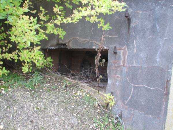Fortified Position of Liège, third line of resistance, bridgeheads, Visé bridgehead, shelter Vi11, 71 m/asl. Located on Rue de Maestricht in the immediate vicinity of the railway bridge and opposite Rue d'Artagnan, this is the fourth counter-assault shelter of the bridgehead, a single-level type with an embrasure for a 47 mm anti-tank gun, an embrasure for a machine gun and an embrasure for a 30 cm searchlight. Its roof slab had a GFM type cupola, now torn off for scrap. Inside one still finds numerous metallic elements such as the rungs leading up to the cupola, the consoles for the shelves, various hooks as well as part of the forced ventilation. Outside one still finds one of the concrete posts that delimited the military area and the anchor posts for the cables and Cointet barriers of the anti-tank obstacle. It took a nasty hit where the cupola was.