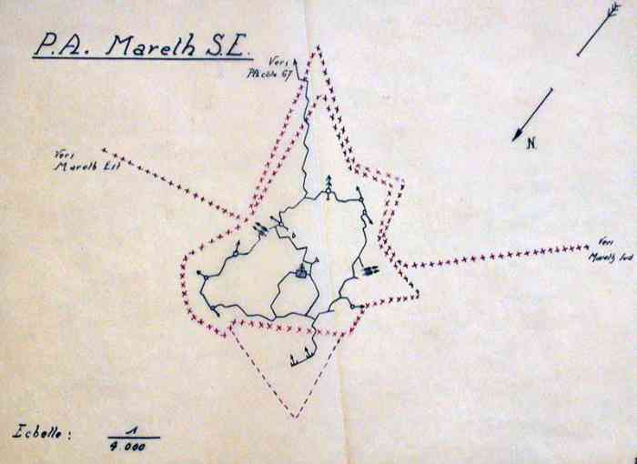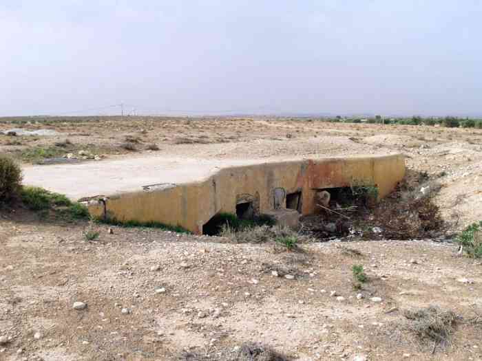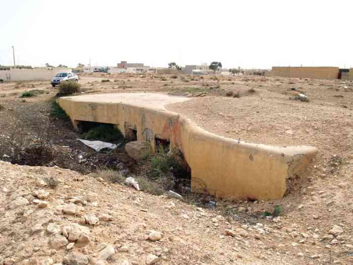 Mareth. Ce point d'appui comprend un poste de commandement de bataillon. Il est toujours présent, en partie remblayé, et sert de dépôt d’ordures. Deux canons antichars de 47 G constituaient l’essentiel de son armement. C’est également la position de batterie de la section de grand flanquement GF2. Dieser Stützpunkt umfasst einen Bataillonsgefechtsstand. Er ist noch vorhanden, teilweise verfüllt und dient als Müllabladeplatz. Zwei 47-mm-Panzerabwehrkanonen G bildeten den Hauptteil seiner Bewaffnung. Es ist auch die Batteriestellung der Sektion für große Flankierung GF2. Dit steunpunt omvat een bataljonscommandopost. Hij is nog aanwezig, gedeeltelijk gedempt, en dient als vuilnisbelt. Twee 47 mm-antitankkanonnen G vormden het voornaamste deel van zijn bewapening. Het is tevens de batterijpositie van de sectie voor grote flankering GF2. This strongpoint comprises a battalion command post. It is still present, partly filled in, and serves as a rubbish dump. Two 47 G anti-tank guns constituted the bulk of its armament. It is also the battery position of the large flanking section GF2. Tento opěrný bod zahrnuje praporové velitelské stanoviště. Je stále přítomno, částečně zasypané a slouží jako skládka odpadků. Hlavní část jeho výzbroje tvořily dva 47mm protitankové kanóny G. Je také bateriovým postavením sekce pro velké flankování GF2. © JJM 05/03/2026