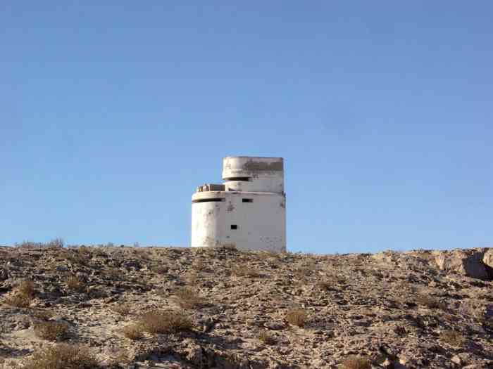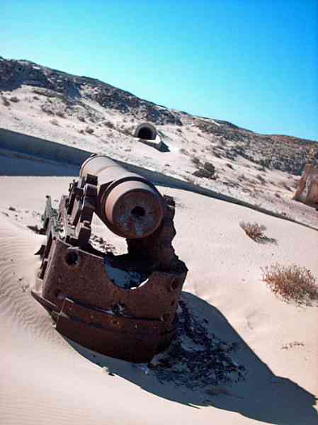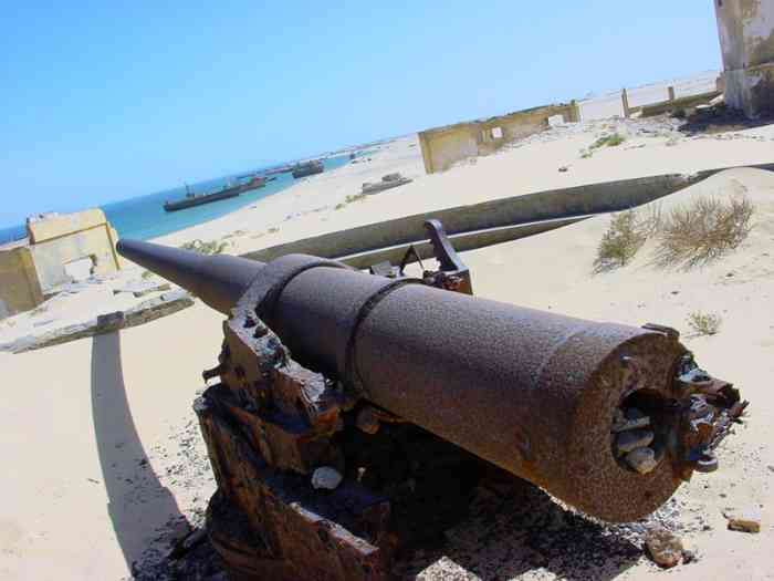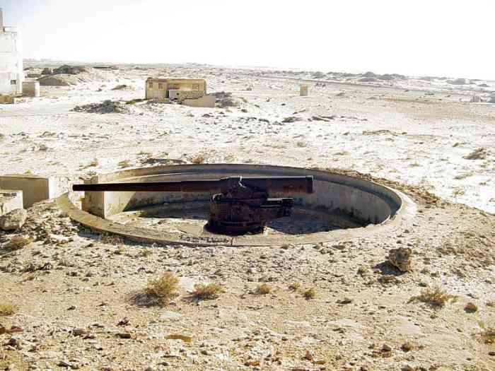 Port-Etienne. Mise en place entre 1938 et 1940, cette batterie fixe d’artillerie secondaire est armée de quatre canons de 164 Mle 1887 sur affût Mle 1893-14, en provenance de Dakar, où ils ont été remplacés par des 155 Mle 32. Les pièces sont disposées dans de grandes cuves bétonnées, avec niches attenantes. La batterie dispose d’un magasin semi-enterré et d’un projecteur de 150 GP. Le conjugateur « colonies » n’étant jamais arrivé, la conduite du tir est assurée par un conjugateur de bord modifié, assisté par un télémètre de cinq mètres OPL, placés dans un beau PDT qui figure, chose rare, sur l’insigne de la batterie. La batterie est encore bien visible, et les canons sont encore en place dans leurs cuves. Dans la nuit du 20 au 21 janvier 1943, le sous-marin allemand U-66 débarque trois hommes, parmi lesquels un agent français recruté par l’Abwehr (nom de code Lallark), à Rio Ora, sur la côte du Sahara occidental espagnol, à quelques kilomètres de la batterie. Ce n’est pas leur objectif, mais ils n’ont pas abordé exactement à l’endroit prévu, et sans le savoir se dirigent droit sur elle. Après un tir de sommation de la section de tirailleurs sénégalais qui la garde, le saboteur et les deux marins allemands qui l’ont amené sont faits prisonniers. Aussi nommée batterie de Port-Étienne. Diese zwischen 1938 und 1940 errichtete feste Sekundärartilleriebatterie ist mit vier 164-mm-Kanonen Mle 1887 auf Lafette Mle 1893-14 bewaffnet, die aus Dakar stammen, wo sie durch 155-mm-Kanonen Mle 32 ersetzt wurden. Die Geschütze sind in großen betonierten Gruben mit angrenzenden Nischen angeordnet. Die Batterie verfügt über ein halbunterirdisches Magazin und einen 150-cm-Scheinwerfer GP. Da der „Kolonien“-Konjugator nie eintraf, wird die Feuerleitung durch einen modifizierten Bordkonjugator sichergestellt, unterstützt von einem 5-Meter-Entfernungsmesser OPL, die sich in einem schönen Feuerleitstand befinden, der, eine Seltenheit, auf dem Abzeichen der Batterie abgebildet ist. Die Batterie ist noch gut sichtbar, und die Kanonen sind noch in ihren Gruben vorhanden. In der Nacht vom 20. auf den 21. Januar 1943 setzt das deutsche U-Boot U-66 drei Männer an Land, darunter einen von der Abwehr angeworbenen französischen Agenten (Deckname Lallark), bei Rio Ora an der Küste der spanischen Westsahara, wenige Kilometer von der Batterie entfernt. Dies ist nicht ihr Ziel, aber sie sind nicht genau an der vorgesehenen Stelle gelandet und gehen ahnungslos direkt darauf zu. Nach einem Warnschuss der sie bewachenden senegalesischen Schützensektion werden der Saboteur und die beiden deutschen Matrosen, die ihn gebracht haben, gefangen genommen. Auch Batterie von Port-Étienne genannt. Opgesteld tussen 1938 en 1940, is deze vaste secundaire artilleriebatterij bewapend met vier kanonnen van 164 mm Mle 1887 op affuit Mle 1893-14, afkomstig uit Dakar, waar ze werden vervangen door 155 mm-kanonnen Mle 32. De stukken zijn geplaatst in grote betonnen kazematten met aangrenzende nissen. De batterij beschikt over een halfondergronds magazijn en een zoeklicht van 150 cm GP. Daar de „koloniën“-conjugator nooit is aangekomen, wordt de vuurleiding verzorgd door een aangepaste scheepsconjugator, bijgestaan door een vijf-meter afstandsmeter OPL, geplaatst in een mooie vuurleidingspost die, een zeldzaamheid, staat afgebeeld op het embleem van de batterij. De batterij is nog goed zichtbaar, en de kanonnen zijn nog aanwezig in hun kazematten. In de nacht van 20 op 21 januari 1943 zet de Duitse onderzeeër U-66 drie mannen aan land, onder wie een door de Abwehr gerekruteerde Franse agent (codenaam Lallark), bij Rio Ora aan de kust van de Spaanse Westelijke Sahara, op enkele kilometers van de batterij. Dit is niet hun doel, maar ze zijn niet precies op de voorziene plaats aangekomen en lopen, zonder het te weten, recht op haar af. Na een waarschuwingsschot van de sectie Senegalese tirailleurs die haar bewaakt, worden de saboteur en de twee Duitse matrozen die hem hebben gebracht, gevangengenomen. Ook batterij van Port-Étienne genoemd. Set up between 1938 and 1940, this fixed secondary artillery battery is armed with four 164 mm guns Mle 1887 on mounting Mle 1893-14, from Dakar, where they were replaced by 155 mm guns Mle 32. The pieces are arranged in large concrete pits, with adjacent niches. The battery has a semi-buried magazine and a 150 cm searchlight GP. The “colonies” conjugator never having arrived, fire control is provided by a modified naval conjugator, assisted by a five-metre rangefinder OPL, placed in a fine fire control post which, a rare thing, appears on the battery's insignia. The battery is still clearly visible, and the guns are still in place in their pits. On the night of 20-21 January 1943, the German submarine U-66 lands three men, including a French agent recruited by the Abwehr (code name Lallark), at Rio Ora, on the coast of the Spanish Western Sahara, a few kilometres from the battery. This is not their objective, but they did not land exactly at the intended place, and unknowingly head straight for it. After a warning shot from the Senegalese riflemen section guarding it, the saboteur and the two German sailors who brought him are taken prisoner. Also called Port-Étienne battery. Tato pevná baterie sekundárního dělostřelectva, zřízená v letech 1938 až 1940, je vyzbrojena čtyřmi 164mm děly vz. 1887 na lafetě vz. 1893-14, pocházejícími z Dakaru, kde byla nahrazena 155mm děly vz. 32. Kusy jsou umístěny ve velkých betonových jámách s přilehlými nikami. Baterie má polozapuštěné skladiště a světlomet o průměru 150 cm GP. Protože „koloniální“ konjugátor nikdy nedorazil, řízení palby zajišťuje upravený lodní konjugátor, podporovaný pětimetrovým dálkoměrem OPL, umístěné v pěkné zbrojnici, která je, což je vzácnost, vyobrazena na odznaku baterie. Baterie je stále dobře vidit