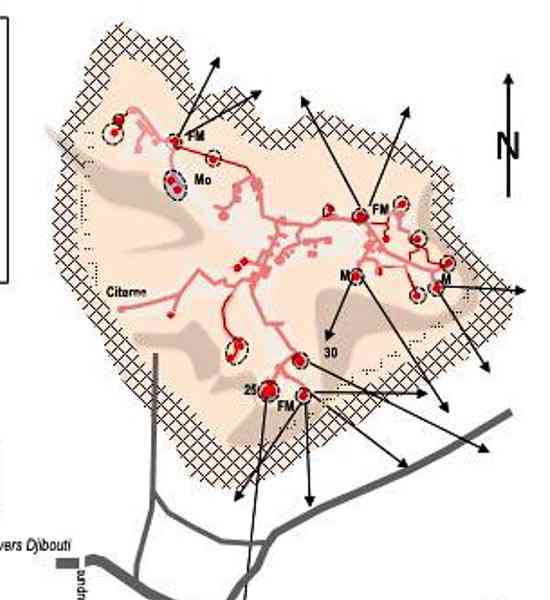 CFS. Dans les années précédant la Seconde Guerre mondiale, une position fortifiée est établie à la frontière avec l’Éthiopie, afin de protéger la colonie d’une éventuelle attaque de l’Italie fasciste. Interdisant la route et la voie ferrée, elle est composée de blockhaus reliés par une galerie souterraine. In den Jahren vor dem Zweiten Weltkrieg wird an der Grenze zu Äthiopien eine befestigte Stellung errichtet, um die Kolonie vor einem möglichen Angriff des faschistischen Italiens zu schützen. Sie sperrt die Straße und die Eisenbahnlinie und besteht aus Bunkern, die durch einen unterirdischen Stollen verbunden sind. In de jaren voorafgaand aan de Tweede Wereldoorlog wordt een versterkte positie opgericht aan de grens met Ethiopië, om de kolonie te beschermen tegen een mogelijke aanval van het fascistische Italië. De weg en de spoorlijn versperrend, is zij samengesteld uit bunkers verbonden door een ondergrondse gang. In the years preceding the Second World War, a fortified position is established on the border with Ethiopia, to protect the colony from a possible attack by fascist Italy. Blocking the road and the railway line, it is composed of blockhouses connected by an underground gallery. V letech předcházejících druhé světové válce je na hranici s Etiopií zřízeno opevněné postavení, které má chránit kolonii před případným útokem fašistické Itálie. Blokuje silnici a železniční trať a je tvořeno bunkry propojenými podzemní chodbou. © JJM 20/03/2026