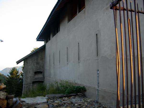 Fortress of Albertville, north-north-west of the city, 1886-1888. 1440 m above sea level. 60 men + 1 officer. Surveillance work, provided with some artillery pieces, dominating Fort Lestal by 600 m (± 2,500 m to the west-north-west). A crenellated enclosure of ± 25 x 40 m including an L-shaped building whose ground floor is furnished with loopholes and comprising a tower projecting to protect its escarp. We encounter here the same concrete that one would believe composed of simple rubble soaked in cement milk as that spotted at the Ruined Redoubt. The bridge of the entrance was removable. All the defensive grilles are present and restored. Singulary, locally, the Alpettaz blockhouse is called "Fort de la Batterie". Owned by the municipality of Marthod since 1958, then taken over by an association in 1998, the blockhouse has recently been restored and its future seems to be heading towards welcoming hikers (06/2006).