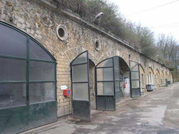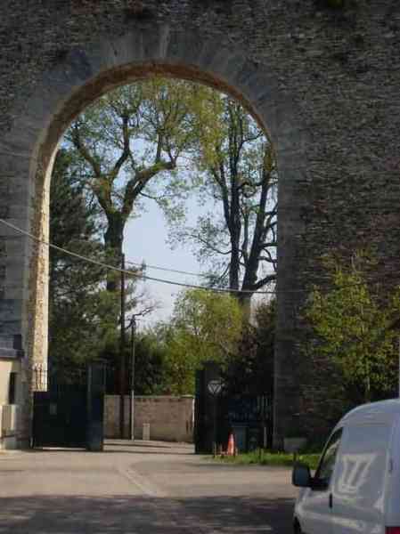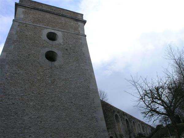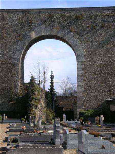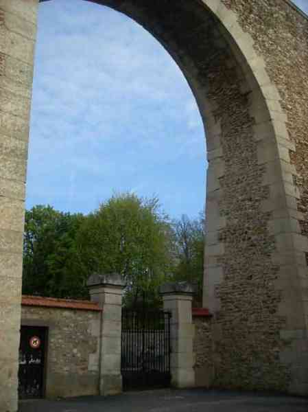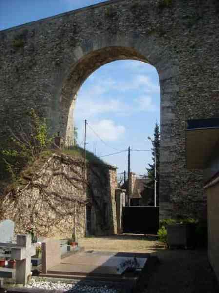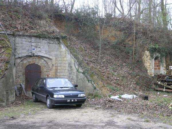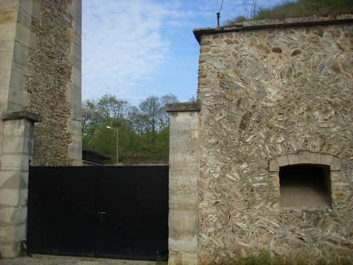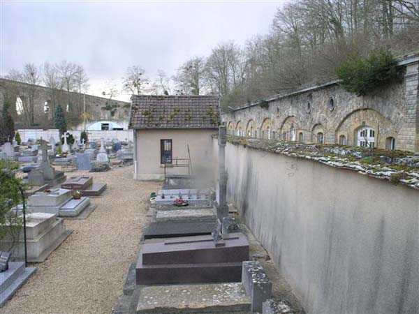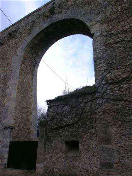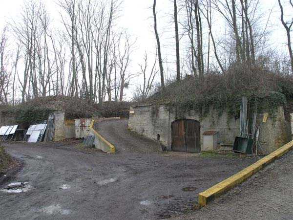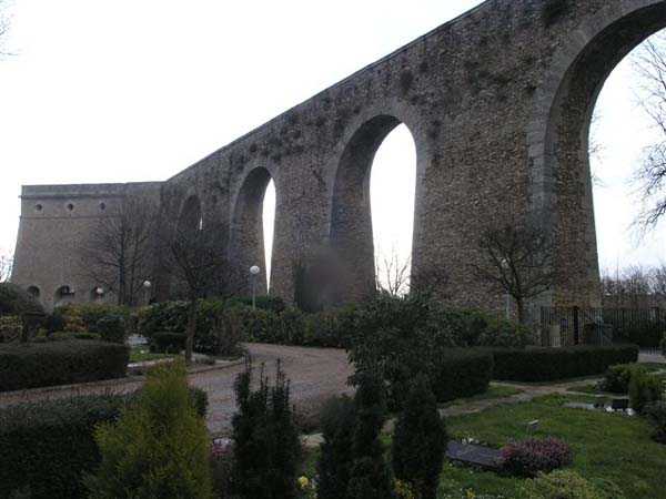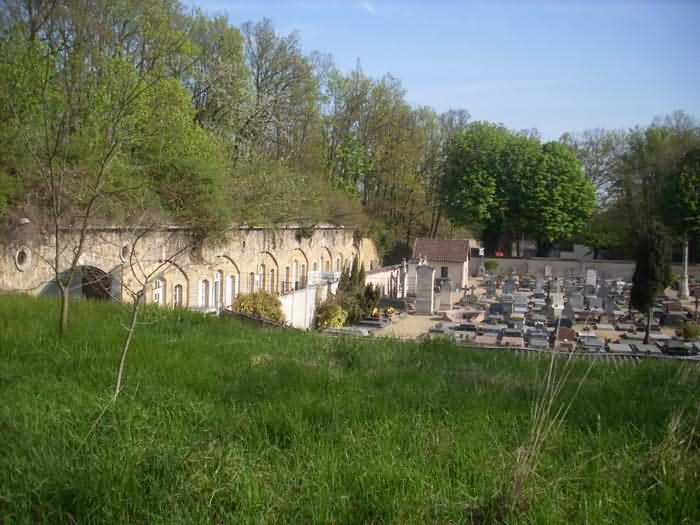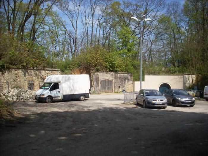 Fortress Paris, west of the city, 1879-1880. Masonry annex to the redoubt of the Trou d'Enfer. 164 men, 18 guns. Battery with the particularity of being established around a cemetery, that of Louveciennes. The gorge is marked by the pillars of the arches of an aqueduct and the entrance rests on one of them. The battery takes the form of an irregular pentagon and only fronts II-III and III-IV seem to have been defended, where necessary, by a double caponier. The barracks are aligned along the western flank of the cemetery. It comprises eight small bays on a single level. On its left, it is crossed by a covered passage giving access to the southern limit of the rue du rempart, which goes around the barracks and cemetery along seven sleepers, mostly of the 1879 model and coated. This line of sleepers abuts, not far from salient V, on the mass of the powder magazine. The perimeter of the battery was partially destroyed in 1972. Currently (03/2007) the municipality has installed a waste disposal site there and the barracks is occupied by services and a small theater troupe. The ditch is completely filled in and the powder magazine serves as a boiler room. This battery is worth the trip due to the originality of its environment. The initial entrance, with guardhouse, opens between two piers of the aqueduct. At the time, the cemetery was only located on the right where older graves (1828, 1842, etc.) can be found before spilling out to the left, but also beyond the powder magazine, probably after the decommissioning of the battery. The Louveciennes aqueduct, built between 1681 and 1685, is 640 meters long and has 36 arches, each 23 meters high. Powered by the famous Marly machine pumping water from the Seine, it is hard to believe that the sole purpose of such a gigantic structure was to guarantee the correct pressure and height for the water jets in the parks of the châteaux of Marly and, later, Versailles. The cemetery is home to some famous figures, such as Emmanuel Frémiet, the sculptor who created the statue of Joan of Arc in Paris and the Archangel Saint Michael on Mont Saint-Michel.