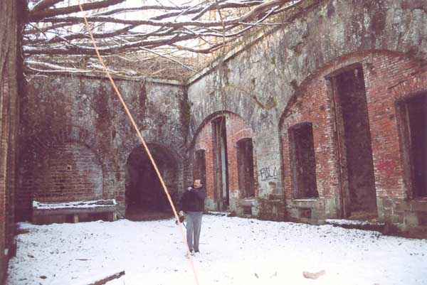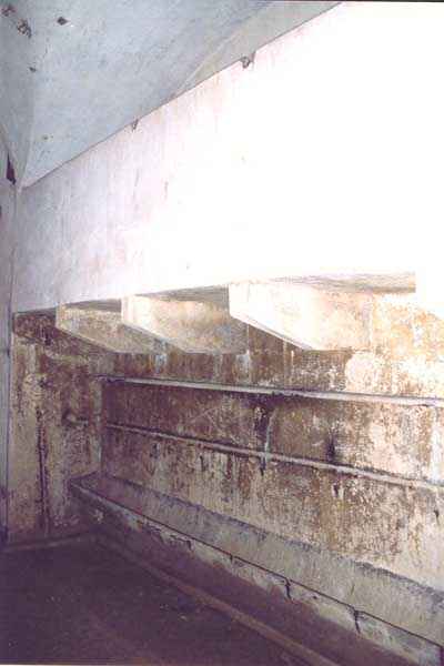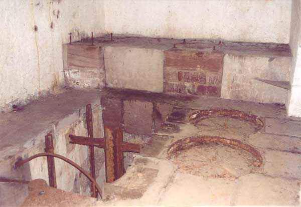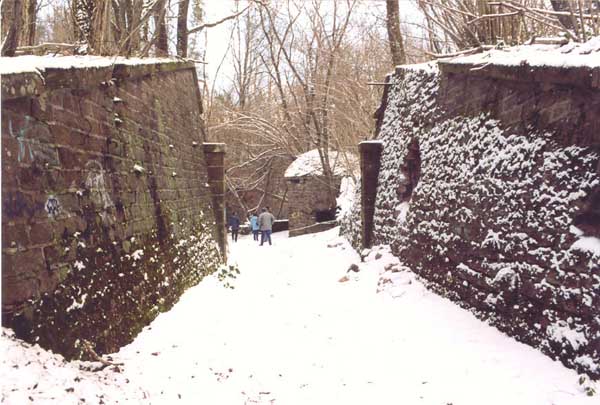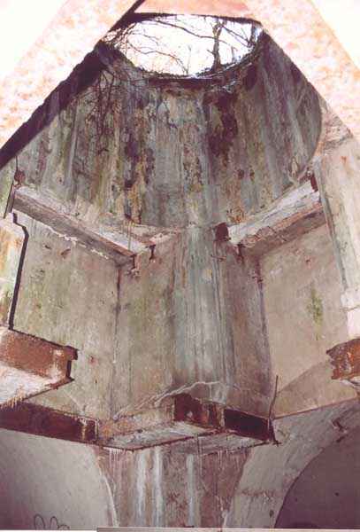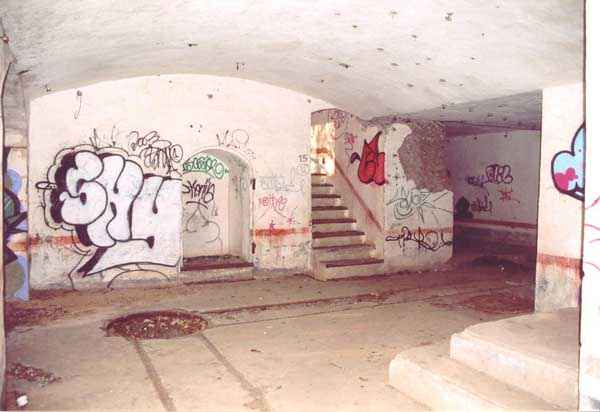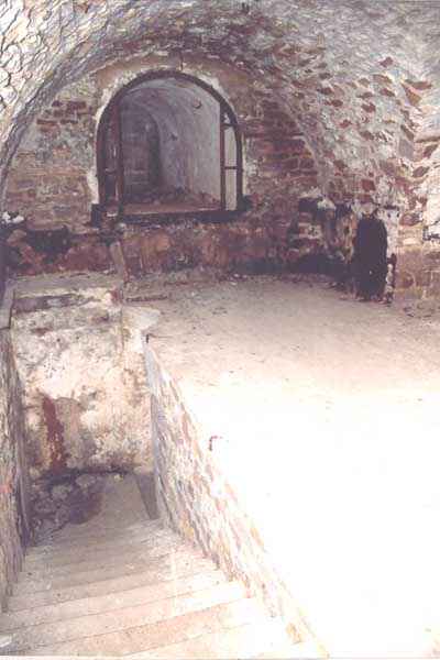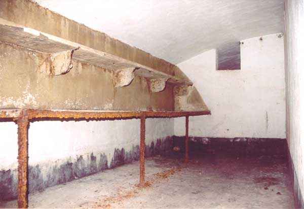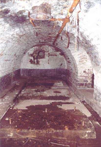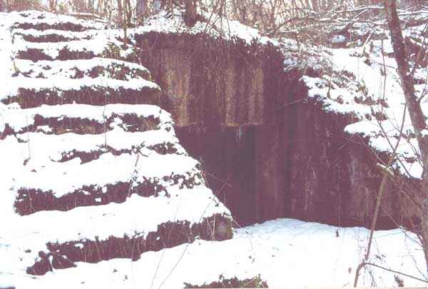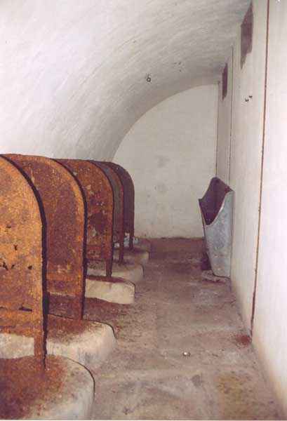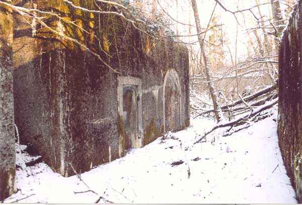 Curtain of the Upper Moselle, 1875-1877. 477 m/alt. Called Fort Berwick. The order to study the structure dates from November 30, 1874. Its position dominating the Moselle valley facing the Vologne valley was considered of prime importance. The successive modernizations that the fort underwent were other indications of this. Officially completed on October 15, 1877, Arches was then an almost square fort for 354 men and 31 guns. As a worthy stopping fort, its artillery ridge could have 360° actions. Each of the fronts was divided into three equal parts by two rooted traverses. The defense of the ditches was entrusted to two wings on the even wings and a double caponier on the III salient. The armament of these organs was then four machine guns and as many 7-pounder cannons. However, what immediately distinguished Arches from its contemporaries were its two casemates made of rolled iron, an armor made in only four examples. Each of them occupied a rooted traverse of the front facing the Vologne and the road to Saint-Dié. From 1890 to 1892, the fort underwent its first transformations. The entrance was concreted and two magazines (+ four workshop premises for loading projectiles and gargoyles) were dug at a depth of about ten meters under the front. These magazines, all connected, were supplied by a sloping gallery starting from the postern under the entrance. Two freight elevators connected the whole to the surface. In 1897, one of the five Galopin Mle 1890 turrets for two 155 mm L de Bange guns was installed behind its salient III. One of the two freight elevators, just mentioned, opens near this turret. It was during these years that the rolled iron casemates were dismantled and sent to Verdun. They were the victims of the complete reorganization of the rue du rempart. From 1896 to 1901 the fort was to undergo a serious overhaul. Almost in the center of fronts II-III and III-IV, a very special block, for which Arches also had exclusive rights, was cast. These were ammunition bunkers topped with a double platform with an ammunition well at parapet level. The entrance to the bunker opens between two wide staircases. Gun shelters were also concreted on front I-II. A war barracks, with seven barracks, will be built in the scarp at the bottom of the gorge ditch between the entrance and salient I. The caponiers will be replaced by counterscarp chests. The casemated optical post will also be concreted (two crenels towards the Bambois and Mouche forts in Épinal). The powder magazine, with an initial capacity of 45,000 kg, will be partially filled in – as will its side shafts and its lamp room – and the crawl spaces underneath will be re-excavated to create a new storage space. Ultimately, few parts of the fort will remain visible except for those covered with special concrete during the first concreting phase. The first barracks, however, remained practically as they were except for the central crosspiece separating the two courtyards in light wells onto which the barracks open. These, six in number (twice three) on a single level, faced as many various magazines. The concreting of the central traverse encroached on the interior space of those adjacent to it. Curiously, the flanking galleries of the escarpment of the fins were also preserved. Finally, no fewer than four machine gun turrets were installed, one at each salient. The shafts of those of salients I, II and IV have the particularity of having to be reached by ladders; as for that of salient III, its access gallery is grafted onto the concrete ring of the Galopin turret. In 1907, the armoring was completed by the installation, behind the 155 L turret, of an eclipsing turret for a searchlight. The fort never saw combat. It was probably still maintained after the First World War, but we lack information on this subject. In any case, its armor was conscientiously ironed out, then its entrance was walled up and it fell into oblivion. We visited it in February 2004. What struck us immediately was the great depth of its ditches. On the other hand, its entrance is very narrow; unfortunately, we did not measure it, but its porch must not exceed 220 cm in width and at most 300 in height. In front of the entrance, a small guardhouse protects the access road. Its counterscarp walls are made of relieving arches. As expected, the entrance facing is made of pink Vosges sandstone rubble. The rolling bridge with side-sliding is still present, as are the two leaves of the sliding door and, beyond the guardhouse, the bread oven has retained its metal elements and seems salvageable. The war barracks has, despite the reinforcement of the fort, retained some shelves, fan supports and a wash house with a high cistern. The network of galleries serving the stores under the rock seems very long, especially since a gallery runs under the glacis at salient III towards a sewer, while also serving the double vault and an infantry outlet. The latter consists of a concrete block about fifteen meters behind the double vault. For its defense, this block includes a pit surmounted by a removable bridge. An infantry parapet with an armored sentry box (still present) is attached to its right. The freight elevators of the deep magazines have each retained their two cages. The initial barracks show facades of terracotta bricks framed by cut stone arches. Note, as in Belfort, a cross painted on the walls of the vaults opposite the 12-breech pieces. This armament must have been modified later because the firing chambers show Mle 1900 machine gun mounts. The platforms of fronts II-III and III-IV have retained their Mle 1883 plates with hydraulic brake used indifferently for 120 L or 155 L guns on siege carriage and square. We will also remember the heads of the freight elevator shafts with their cast iron spiral staircase, the latrines that have retained their zinc urinals, the impressive dimensions of the substructures of the Galopin turret, the presence of its grilles 