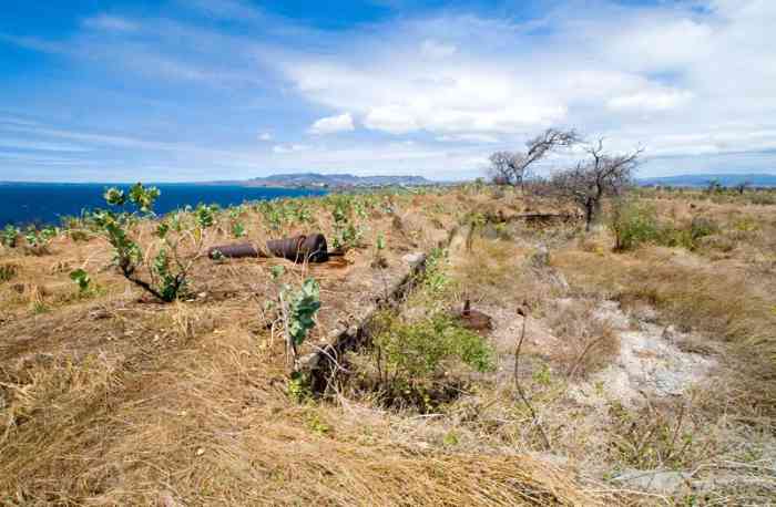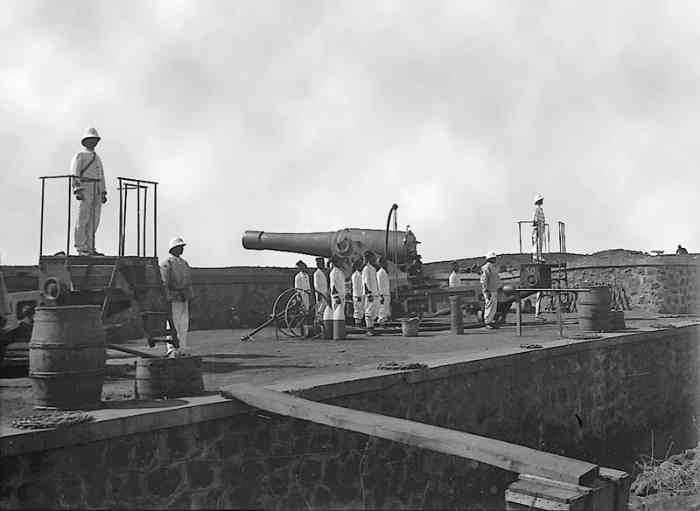 Diego-Suarez. Située à l’extrémité de l’isthme d’Andrakaka, à 1 500 mètres au nord du cap Diego, et à l’altitude de 37 mètres, cette batterie de bombardement devait, comme les batteries de Vatomainty et du Phare, recevoir des canons de 194 Mle 1870-93. L’urgence créée par les événements de Fachoda les a fait remplacer par des canons M de 24 cm Mle 1870 sur affût M Mle 1876.T.86 PA. La portée de ces canons est de 9 900 mètres avec l’obus en fonte allongé, et la cadence de tir de 1 coup par pièce toutes les 3 minutes. Le champ de tir s’étend sur 120°, du cap Vatomainty à la baie des Français. Les pièces sont groupées par 2 dans des alvéoles maçonnées, séparées et encadrées par des abris traverse. Il n’y a pas de magasin caverne. Le ravitaillement en munitions est assuré à l’aide de la voie de 60, à partir des magasins bétonnés situés au cap Diego qui desservent également la batterie de l’Hôpital. Cette batterie est toujours partiellement en service en 1942, armée par la Marine. Les batteries de côte des colonies sont réglementairement servies par l’artillerie coloniale, qui dépend du ministère des Colonies pour le matériel, et du ministère de la Guerre pour le personnel. Mais, en 1942, la Marine qui, après les événements de Dakar, ne fait pas une entière confiance à la Guerre pour la défense des bases coloniales, s’est octroyée le contrôle de 2 batteries, celle d’Andrahompotsy et celle du Poste Optique, dans la presqu’île d’Orangéa. La batterie est passablement embroussaillée, mais les tubes des canons sont toujours sur le site, amputés de leur tranche arrière, ainsi que quelques morceaux d’affût. La vue sur les caps Miné et Vatomainty est superbe. Am Ende der Landenge von Andrakaka gelegen, 1 500 Meter nördlich von Cap Diego, auf einer Höhe von 37 Metern, sollte diese Bombardierungsbatterie, wie die Batterien von Vatomainty und vom Phare, 194-mm-Kanonen Mle 1870-93 erhalten. Die durch die Faschoda-Krise verursachte Dringlichkeit führte dazu, dass sie durch 24-cm-M-Kanonen Mle 1870 auf M-Lafette Mle 1876.T.86 PA (Lafette mit vorderem Drehpunkt) ersetzt wurden. Die Reichweite dieser Kanonen beträgt 9 900 Meter mit der länglichen Gusseisengranate, und die Feuerrate beträgt 1 Schuss pro Geschütz alle 3 Minuten. Das Schussfeld erstreckt sich über 120°, von Cap Vatomainty bis zur Baie des Français. Die Geschütze sind paarweise in gemauerten Zellen angeordnet, getrennt und eingerahmt von Traversenunterständen. Es gibt kein Kavernenmagazin. Die Munitionsversorgung erfolgt über die Feldbahn der Spurweite 60 von den betonierten Magazinen am Cap Diego, die auch die Batterie de l’Hôpital versorgen. Diese Batterie ist 1942 noch teilweise im Dienst, von der Marine bedient. Die Küstenbatterien der Kolonien werden regulär von der Kolonialartillerie bedient, die für das Material vom Kolonialministerium und für das Personal vom Kriegsministerium abhängt. Aber 1942 hat sich die Marine, die nach den Ereignissen von Dakar dem Kriegsministerium für die Verteidigung der Kolonialbasen nicht voll vertraut, die Kontrolle über 2 Batterien angeeignet, die von Andrahompotsy und die vom Poste Optique auf der Halbinsel Orangéa. Die Batterie ist ziemlich zugewachsen, aber die Kanonenrohre sind noch auf dem Gelände vorhanden, ihres hinteren Teils beraubt, sowie einige Lafettenteile. Die Aussicht auf die Caps Miné und Vatomainty ist herrlich. Gelegen aan het uiteinde van de landengte van Andrakaka, op 1 500 meter ten noorden van Kaap Diego, en op 37 meter hoogte, moest deze bombardementsbatterij, net als de batterijen van Vatomainty en van de Vuurtoren, 194 mm-kanonnen Mle 1870-93 ontvangen. De urgentie veroorzaakt door de Fashoda-crisis leidde ertoe dat ze werden vervangen door 24 cm M-kanonnen Mle 1870 op M-affuit Mle 1876.T.86 PA (affuit met voorste draaipunt). Het bereik van deze kanonnen is 9 900 meter met de langwerpige gietijzeren granaat, en de vuursnelheid is 1 schot per stuk om de 3 minuten. Het schootsveld strekt zich uit over 120°, van Kaap Vatomainty tot de Baai van de Fransen. De stukken zijn gegroepeerd per 2 in gemetselde cellen, gescheiden en omlijst door traversenonderkomens. Er is geen grotmagazijn. De munitiebevoorrading wordt verzorgd met behulp van het veldspoor van spoorwijdte 60, vanuit de betonnen magazijnen op Kaap Diego die ook de batterij van het Hôpital bedienen. Deze batterij is in 1942 nog gedeeltelijk in dienst, bediend door de Marine. De kustbatterijen van de koloniën worden reglementair bediend door de koloniale artillerie, die voor het materieel afhangt van het ministerie van Koloniën, en voor het personeel van het ministerie van Oorlog. Maar in 1942 heeft de Marine, die na de gebeurtenissen van Dakar het ministerie van Oorlog niet volledig vertrouwt voor de verdediging van de koloniale basissen, zich de controle toegeëigend over 2 batterijen, die van Andrahompotsy en die van de Poste Optique op het schiereiland Orangéa. De batterij is behoorlijk overwoekerd, maar de kanonslopen zijn nog op de site aanwezig, ontdaan van hun achterste gedeelte, alsmede enkele affuitstukken. Het uitzicht op de Kapen Miné en Vatomainty is prachtig. Located at the end of the Andrakaka isthmus, 1,500 metres north of Cape Diego, at an altitude of 37 metres, this bombardment battery was intended, like the Vatomainty and Lighthouse batteries, to receive 194 mm guns Mle 1870-93. The urgency created by the Fashoda crisis led to their replacement by 24 cm M guns Mle 1870 on M mounting Mle 1876.T.86 PA (mounting with anterior pivot point). The range of these guns is 9,900 metres with the elongated cast iron shell, and the rate of fire is 1 round per piece every 3 minutes. The field of fire extends over 120°, from Cape Vatomainty to Baie des Français. The pieces are grouped in pairs in masonry cells, separated and framed by traverse shelters. There is no cavern magazine. Ammunition supply is p