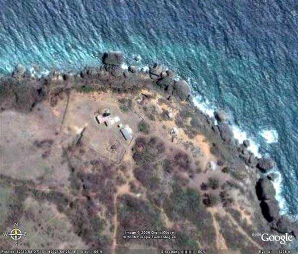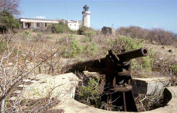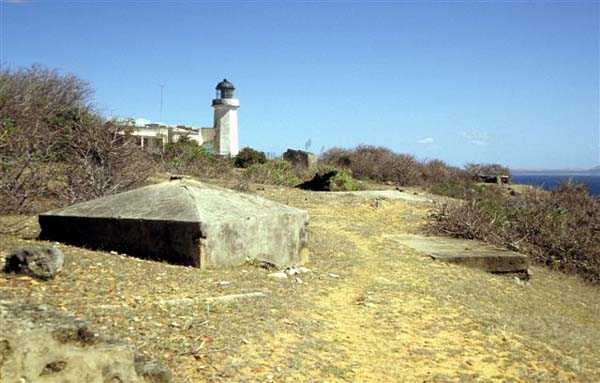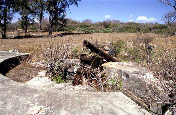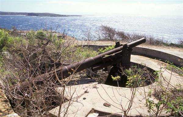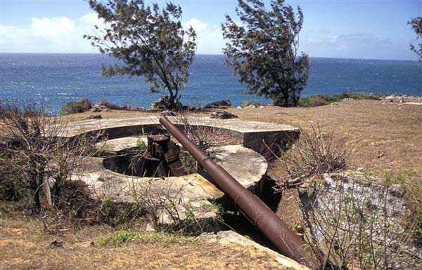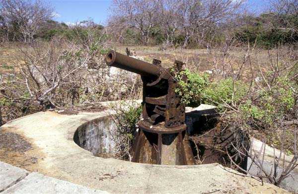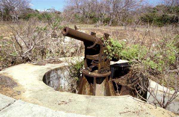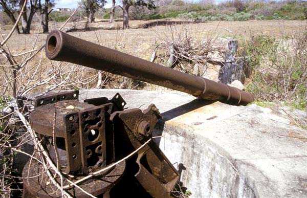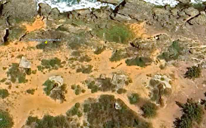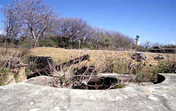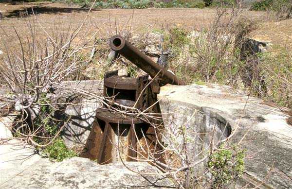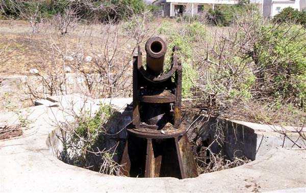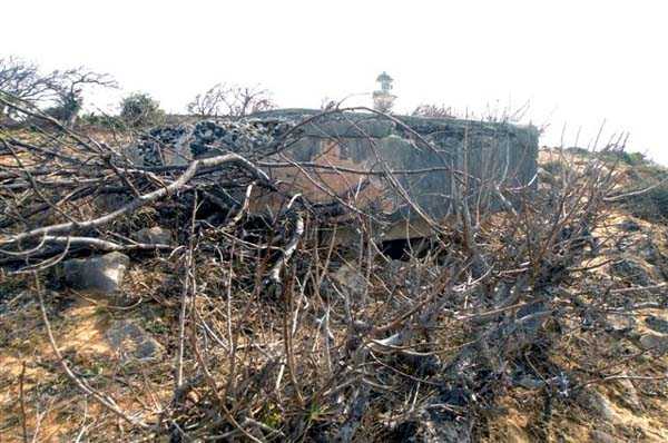 Located near the lighthouse, on the Orangéa peninsula, this battery of British origin consists of 2 152 mm guns, presumably installed in 1943. The 2 guns were scuttled upon the departure of the last French troops. They were blown up, the recoil mechanisms dismantled, and the barrels were thrown backwards. The battery had a small concrete FCP (Fire Control Post) and used, as indicated by English inscriptions, the searchlight shelter of the Gros Rocher. JJM 02/12/07