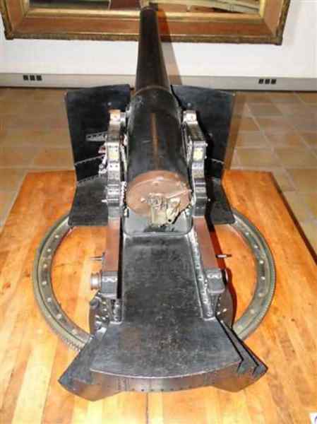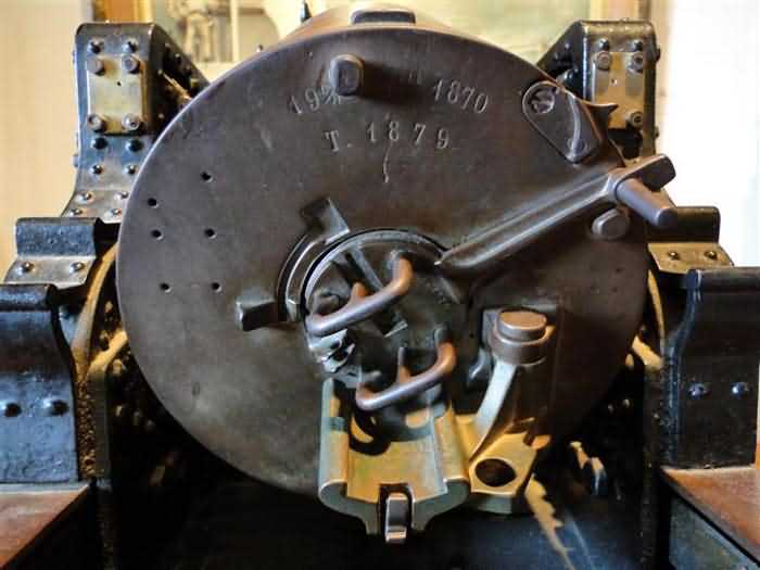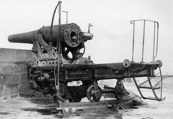 The National Navy Museum in Toulon preserves a remarkable 1:5 scale model of a 19 cm Model 1870 T 79 gun on pivot carriage fitted with an armored shield. This rare feature illustrates early French efforts to protect gun crews behind a metal screen integrated with the platform. The shield, designed to resist splinters and small-calibre fire, marked a significant step in the protection of coastal positions. The model highlights the technical intricacy of the system — linkage between shield and pivot, weight balance, and handling of the barrel — providing tangible evidence of the transition from open to semi-enclosed artillery emplacements.