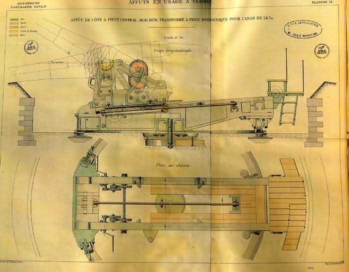 Les canons de 24 centimètres, modèles 1867 à 1903, représentent l’évolution la plus complète de l’artillerie lourde de côte française avant 1914. Montés sur affûts de types PA et PC, des modèles 1876 à 1903, ils combinaient puissance, stabilité et précision sur des positions fixes de défense maritime. Les versions M et G différaient par leur origine de fabrication et leurs adaptations mécaniques, mais partageaient l’usage de crosses de manutention, de plateformes pour servants et de dispositifs de chargement perfectionnés. Les affûts à châssis circulaire, introduits à partir de 1884, améliorèrent la rapidité de pointage et la sécurité du tir. Ces matériels, installés sur tout le littoral atlantique et méditerranéen, incarnent la maturité technique du système Séré de Rivières appliqué à la défense côtière.