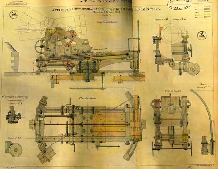 Die 24-Zentimeter-Geschütze, Modelle 1867 bis 1903, stellen die vollständigste Entwicklung der französischen Küstenartillerie vor 1914 dar. Auf Lafetten der Typen PA und PC (Modelle 1876 bis 1903) montiert, verbanden sie Feuerkraft, Stabilität und Präzision in festen Verteidigungsstellungen. Die Varianten M und G unterschieden sich in Herkunft und mechanischer Ausführung, nutzten jedoch dieselben Hebevorrichtungen, Bedienplattformen und Ladehilfen. Die ab 1884 eingeführten Rundchassis-Lafetten verbesserten das Richten und die Sicherheit beim Schuss. Diese Geschütze, entlang der Atlantik- und Mittelmeerküste installiert, verkörpern den technischen Höhepunkt des Séré-de-Rivières-Systems in der Küstenverteidigung.