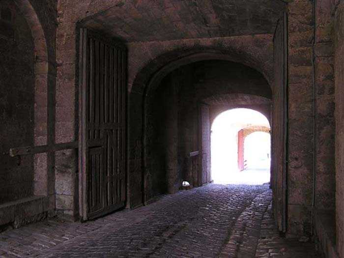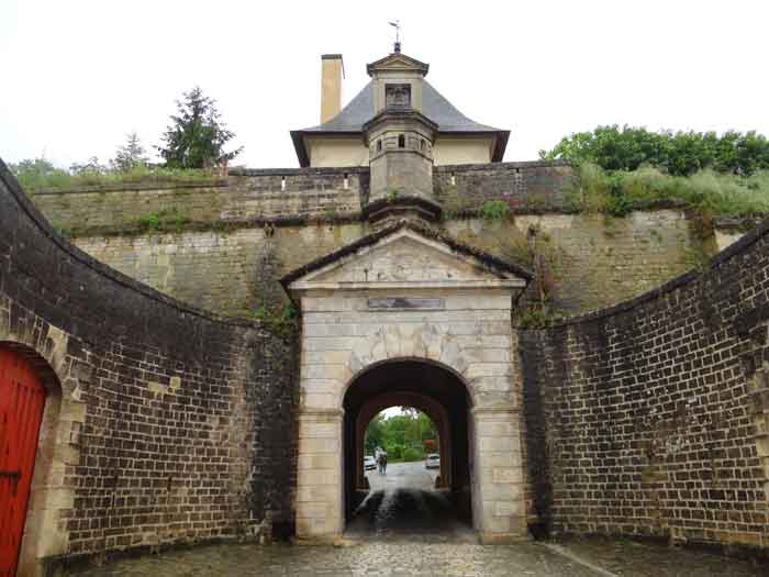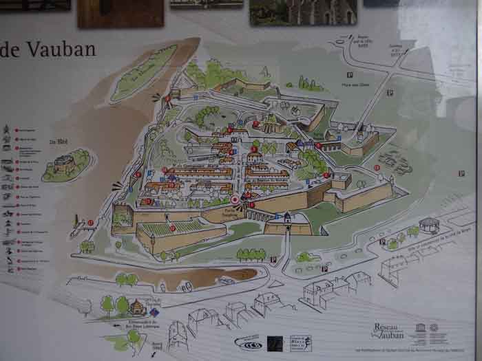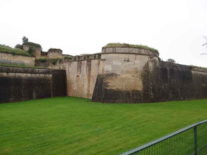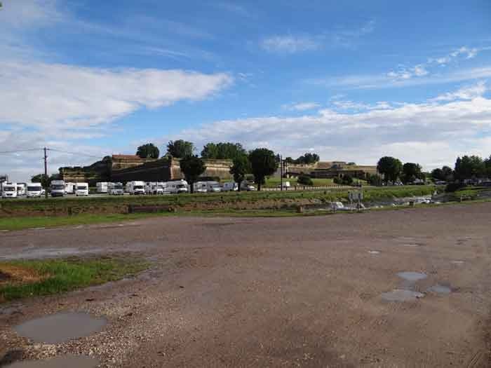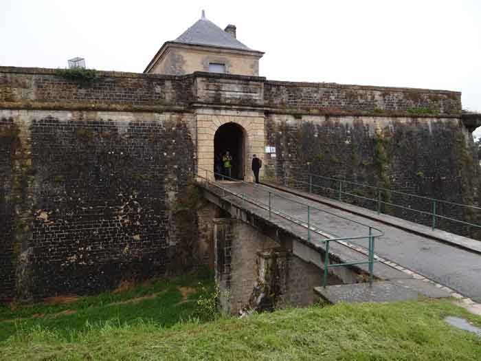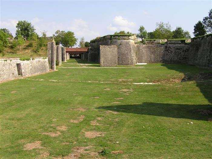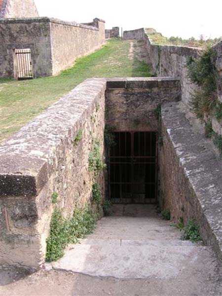 Dept. 33 (Gironde). Rund um eine alte Festungsstadt begann der Ingenieur Pagan (1604-1665) 1652 mit den Arbeiten, die von Vauban übernommen wurden, der zwischen 1685 und 1689 die Bastionen und freistehenden Orgeln anordnete. Die Zitadelle liegt am rechten Ufer der Gironde, einem Fluss, den sie um 45 Meter überragt, und besteht landseitig aus drei Fronten, die von vier Bastionen mit Orillons eingerahmt werden, die durch drei ungleich lange Kurtinen verbunden sind, die selbst von Ravelins bedeckt sind. Zur Zitadelle gehört ein kleines Dorf, das noch heute bewohnt ist. Zusammen mit Fort Pâté und Fort Médoc bildete es die zweite Verteidigungslinie an der Girondemündung. Dieser Status wurde durch ein Ministerialdekret vom 2. März 1887 zunächst herabgestuft, aber schnell wieder in Frage gestellt, da die Mauern im Jahr 1912 nur noch 6 x 19 cm und 4 x 95 cm groß waren. Vor Ort gab es auch drei 47-mm-T.R.-Geschützstellungen, die hinter einer Brustwehr unter einem Feuerkamm ausgerichtet waren, ungefähr in der Mitte der Front entlang des Flusses. Ebenso befinden sich südlich der Batterie des 19. Jahrhunderts die Telemetrie- und Kommandostände einer zweiteiligen großkalibrigen Batterie (24 oder 27 Jahrhundert), deren Feuerstellen leider verschwunden sind. Das Fehlen einer Erwähnung dieser letztgenannten Batterie in der Rüstungserklärung von 1912 deutet darauf hin, dass sie vor diesem Jahr herabgestuft wurde. Heute (09/2007) sind von der Batterie des 19. Jahrhunderts noch zwei hohle Traversen und mindestens drei Kreise der Stützbasis der zentralen Schwenklafetten erhalten. Diese Batterie befindet sich in der Mitte der nördlichen Hälfte des Hauptplatzes und entsprach unter Berücksichtigung von T = Traverse und C = Geschütz der Formel C-T-C-C-C-C-T-C. Die Batterie 47 ist mit ihren Betonblöcken mit vier Befestigungen noch sichtbar, und die 95-mm-Batterie Modell 1888 befindet sich in gutem Zustand an der Nordspitze der Zitadelle. Die Stellungen dieser Batterie sind durch massive Traversen voneinander getrennt, an deren Fuß sich eine Nische für Sicherheitsschüsse befindet. Die Stellungen sind für ein einzelnes Geschütz vorgesehen, und sowohl die Nischentüren als auch die des Magazins links vom Feuerkamm sind vorhanden. Diese Batterie verfügt rechts hinten über ein kleines Schutzgebäude, dessen Tür und zwei Fenster mit einer Verschalung aus flachen Latten versehen sind. Ganz im Süden wurde das alte Pulvermagazin nicht modernisiert. Innerhalb seiner von außen zugänglichen Umfassungsmauer befindet sich jedoch eine Lampennische, ähnlich denen der Steinmagazine. Zudem könnte zwischen der Umfassungsmauer dieses Magazins und dem Wall eine durch ein Tor versperrte Treppe durchaus zu diesem Magazintyp führen, was wir jedoch nicht überprüfen konnten. Die Zitadelle wurde 1937 unter Denkmalschutz gestellt und ist für die Öffentlichkeit zugänglich. Siehe Gironde.