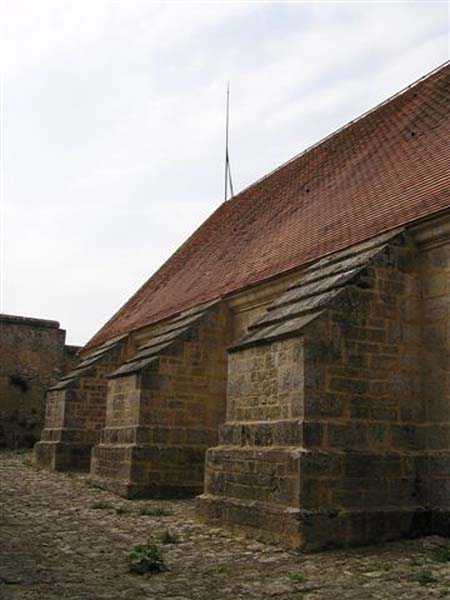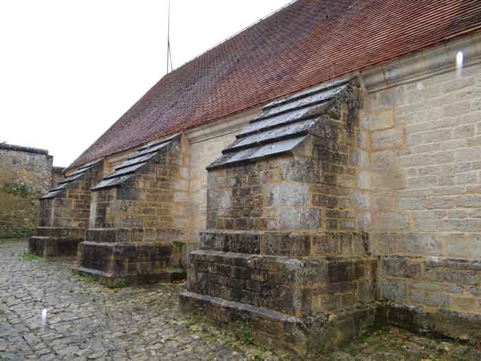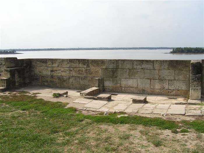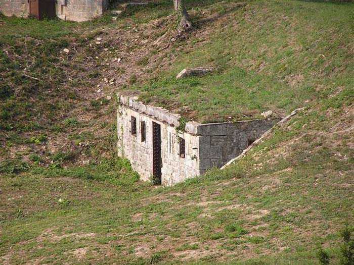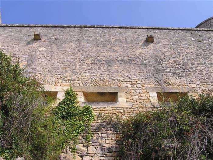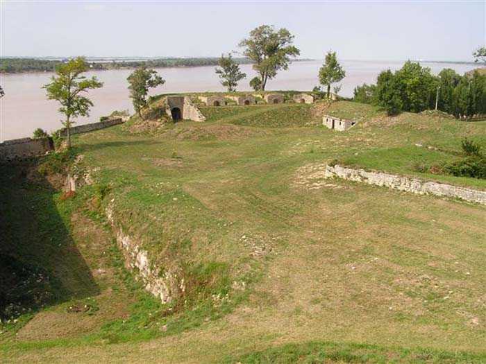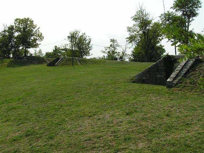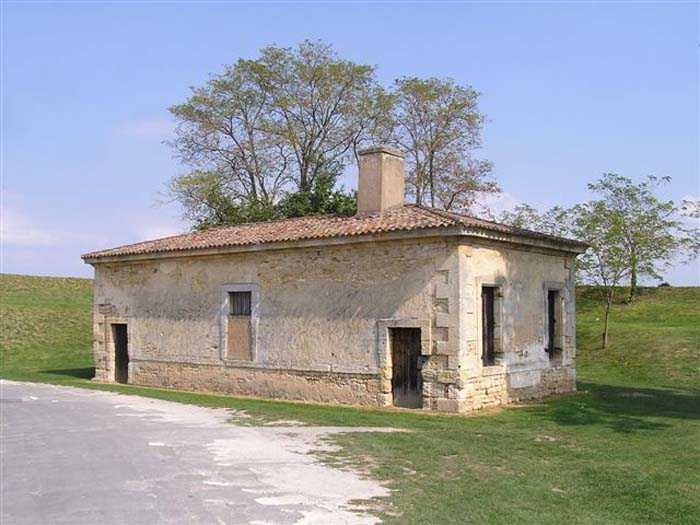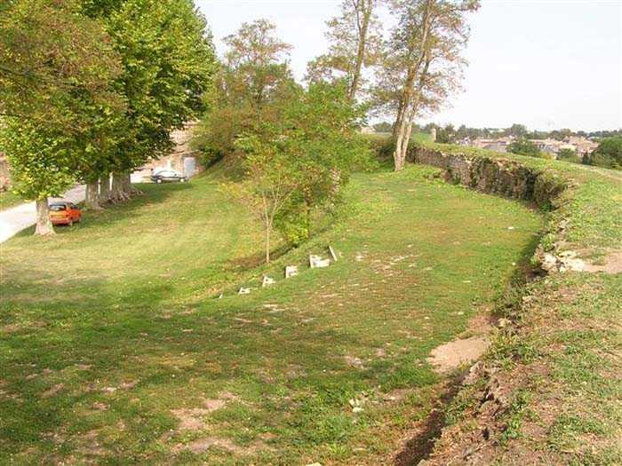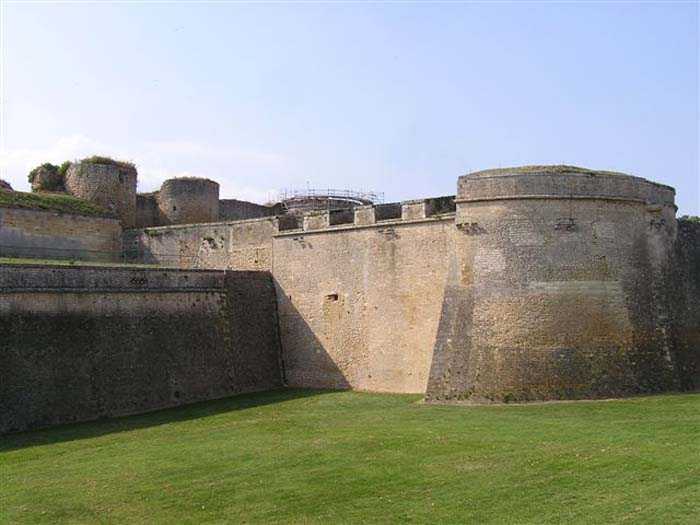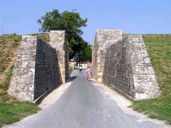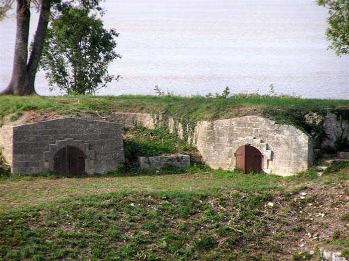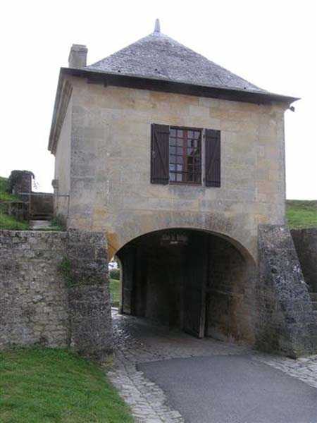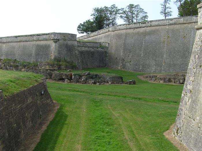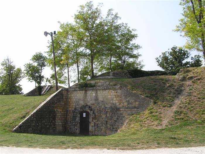 Dept 33 (Gironde). Around an old fortified town, the engineer Pagan (1604-1665) began work in 1652, work taken over by Vauban, who organized the bastions and detached organs between 1685 and 1689. Leaning on the right bank of the Gironde, a river it dominates by 45 meters, on the land side the citadel comprises three fronts framed by four bastions with orillons connected by three curtain walls of unequal lengths, themselves covered by ravelins. The citadel includes a small village still inhabited today. With Fort Pâté and Fort Médoc, it constituted the second line of defense of the mouth of the Gironde. Initially downgraded by ministerial decree on March 2, 1887, this status was quickly called into question because, in 1912, there were 6 x 19 c and 4 x 95 mm. On site, there were also three 47 mm T.R. gun emplacements aligned behind a parapet below a fire ridge, roughly in the center of the front along the river. Similarly, to the south of the 19 c battery, there are the telemetry and command posts of a two-piece large-caliber battery (24 or 27 c) whose firing points have unfortunately disappeared. The lack of mention of this latter battery in the 1912 armament statement suggests its downgrading before that year. Today (09/2007), from the 19 c battery, there remain two hollow traverses and at least three circles of the support base of the central pivot carriages. This battery is located in the center of the northern half of the main square and, considering T = traverse and C = gun, it responded to the formula C-T-C-C-C-C-T-C. The 47 battery remains visible with its concrete blocks with four fixings and the 95 mm model 1888 battery is in good condition, at the northern tip of the citadel. This battery has its emplacements separated by solid traverses at the root of which there is a niche for safety shots. The emplacements are intended for a single gun and both the niche doors and those of the magazine to the left of the fire crest are present. This battery has, at the right rear, a small shelter building whose door and two windows are fitted with a shuttering device with flat strips of battens. To the far south, the old powder magazine has not been modernized. However, within its enclosure, served from the outside, there is a lamp niche similar to those of the rock magazines and, moreover, between the enclosure of this magazine and the rampart, a staircase barred by a gate could very well lead to this type of magazine, which we were unable to verify. The citadel was classified as a Historic Monument in 1937 and is open to the public. See Gironde.