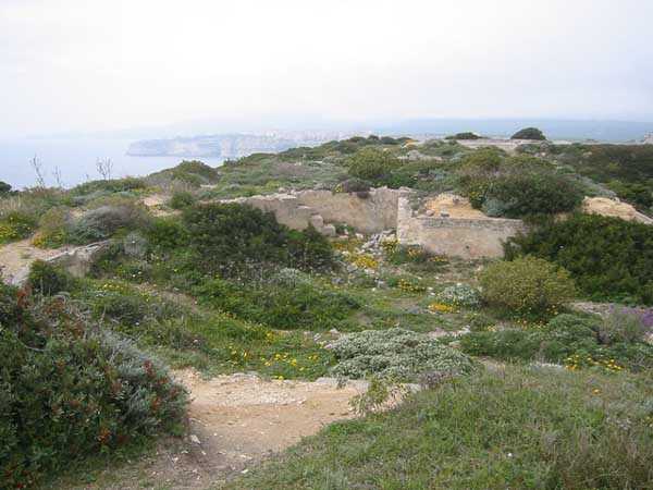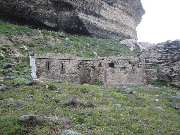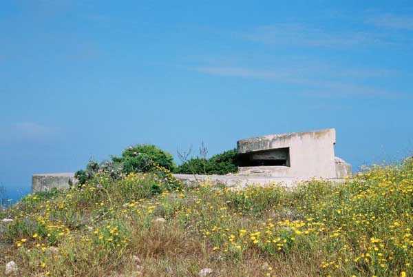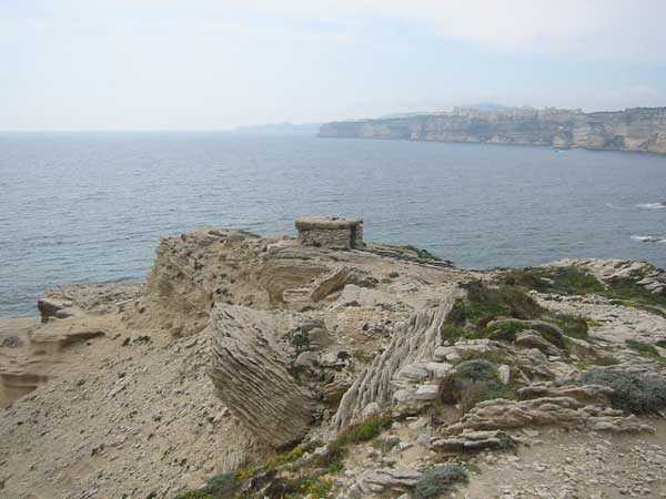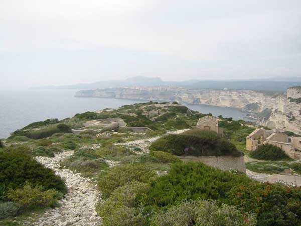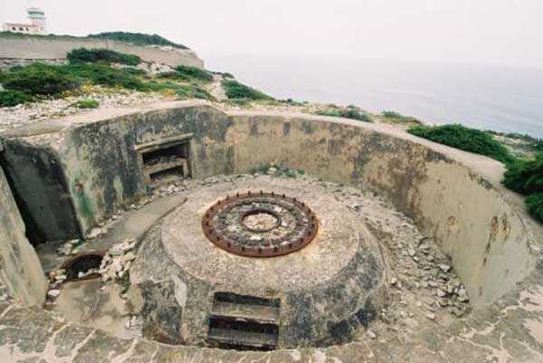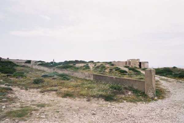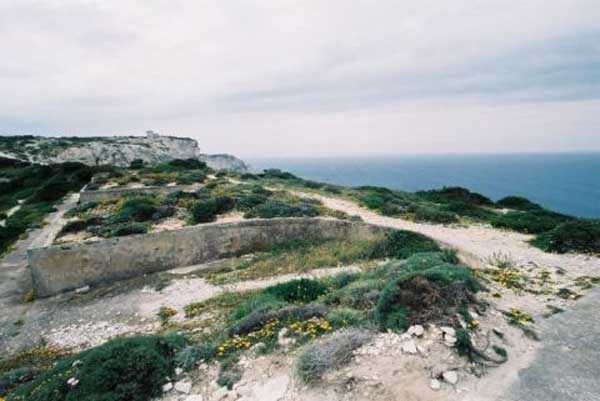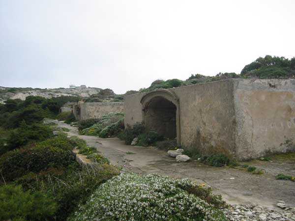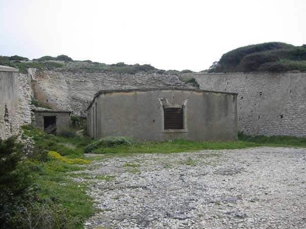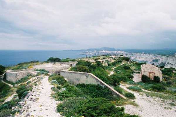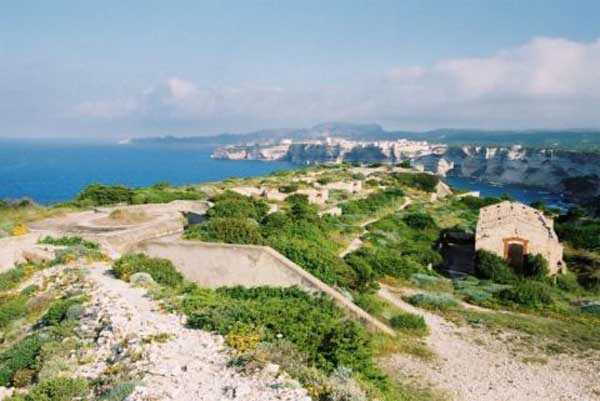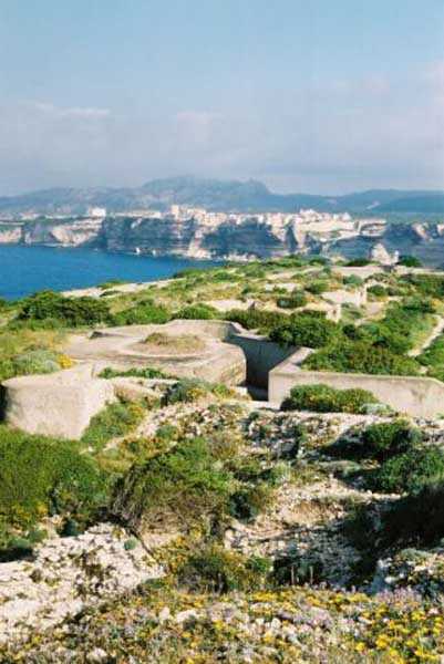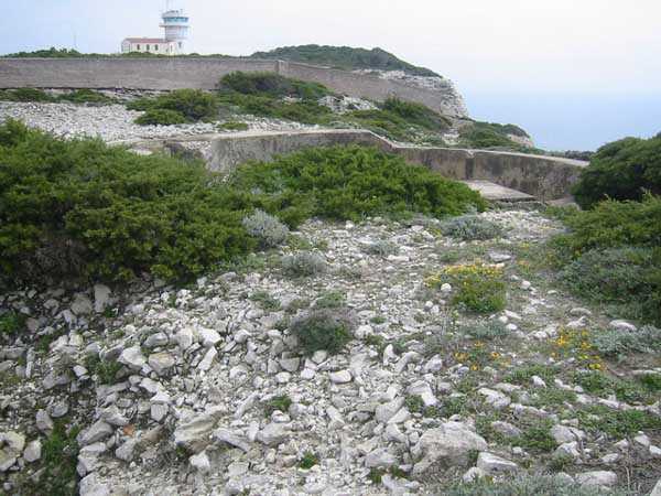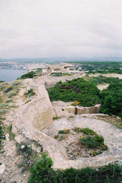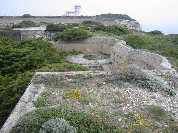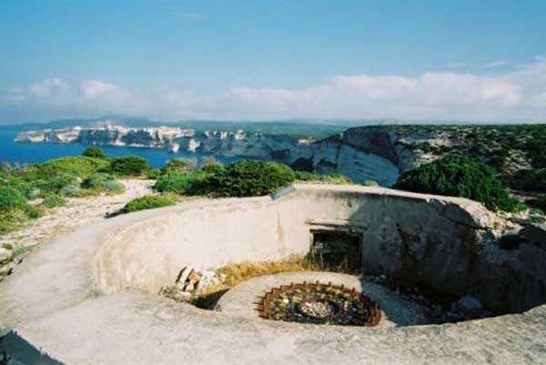 Festung Bonifacio, 1895. Diese Stellung liegt 900 m westsüdwestlich der Batterie Belle Catherine. Dort gab es zwei bewaffnete Batterien, eine mit 4 x 95 mm Lahitolle und die andere mit 4 x 240 mm G Mle 1884 auf G.P.C.-Lafetten. Letztere hatte ein Magazin unter Fels. Diese beiden Batterien sind durch einen überdachten Weg verbunden. Im April 1914 bestand die ihr zugeteilte Stärke aus 1 Offizier, 33 Kanonenschützen und 26 Soldaten. Etwas weiter nordwestlich stand ein Suchscheinwerfer (1899) und einige hundert Meter östlich verhinderte ein Blockhaus (1901), dass ein Feind die Hänge hinabstieg und die Batterie und den Suchscheinwerfer von hinten erreichte. Dieses Blockhaus war mit zwei 37 mm TR-Revolverkanonen bewaffnet und beherbergte am 01.04.1914 40 Soldaten, 7 Kanonenschützen und 1 Offizier. Wir wissen nicht, was von diesen Anlagen übrig geblieben ist, aber zwischen den beiden Kriegen zerstörte die Marine einen Teil der alten 240-mm- und 95-mm-Stellungen, um Panzer für 138 Kanonen Mle 1897 zu installieren. Das Ganze wurde 1963 verkauft und der Zugang ist wahrscheinlich genehmigungspflichtig.